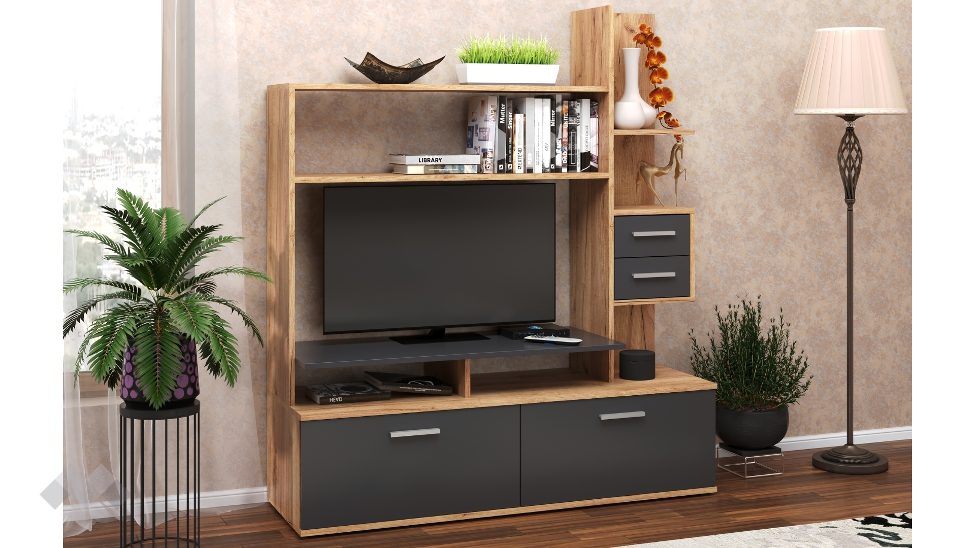 ⭐ Предимства: ✓ компактна и функционална ✓ практично разпределение ✓ семпъл и елегантен дизайн ✓ подходяща и за по-малки жилища ✓ открити рафтове ✓ етажерка ✓ ТВ шкаф ✓ чекмеджета ✓ качествена изработка ✓ 16 мм ПДЧ