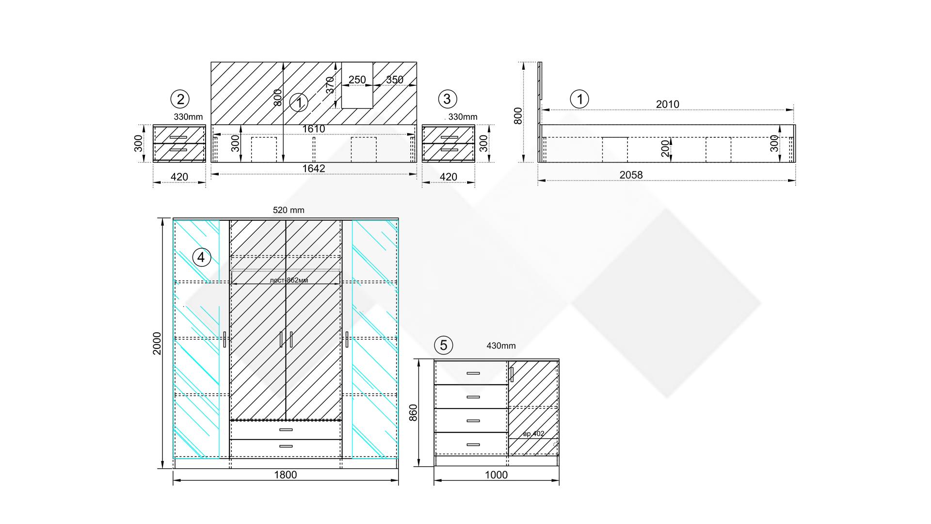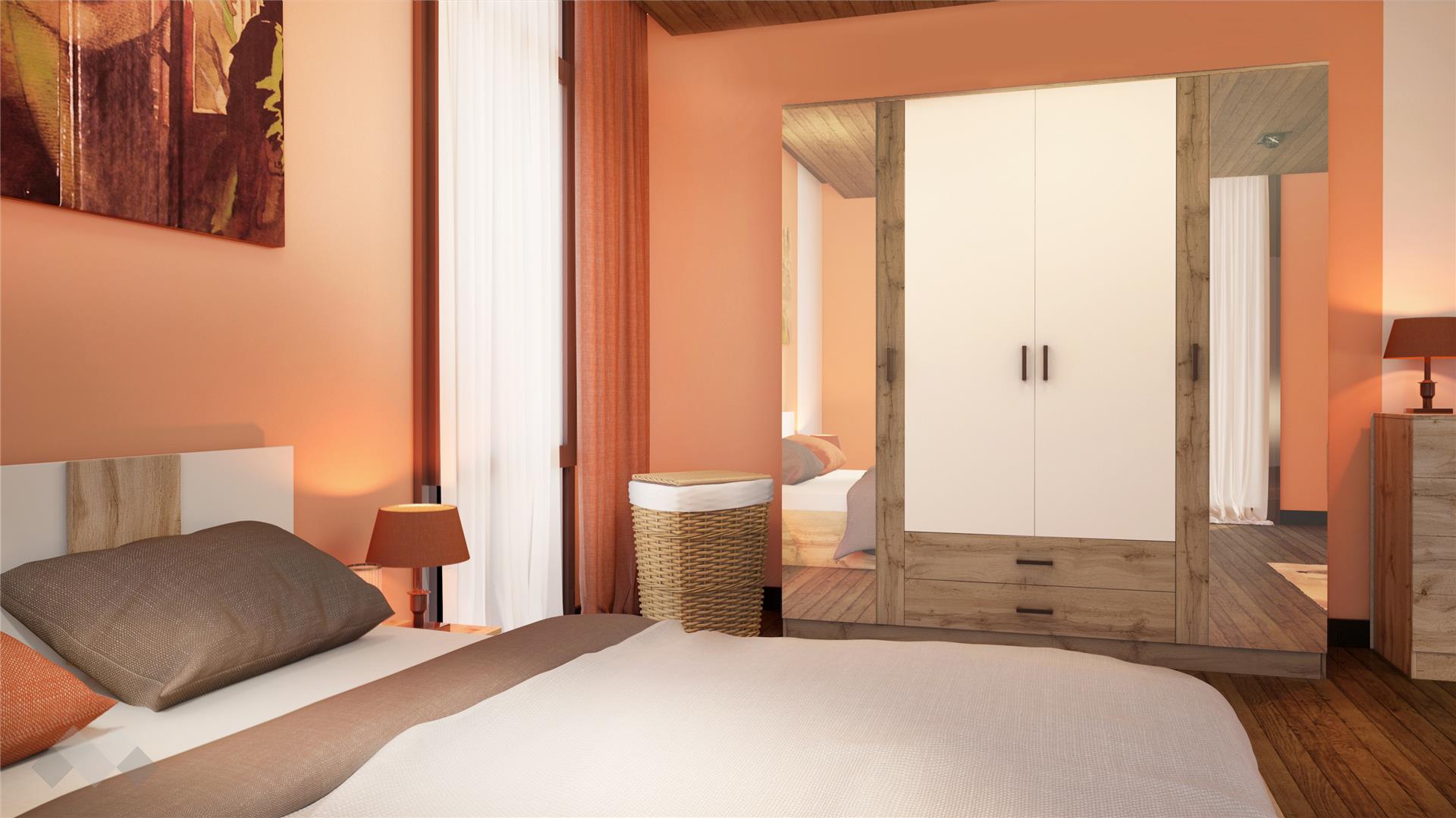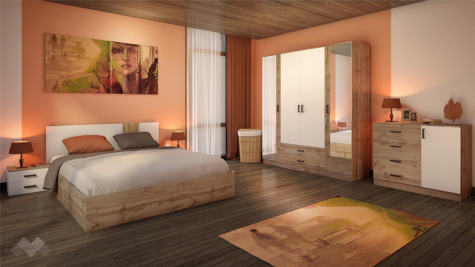 ⭐ Предимства: ✓ модерен винтидж декор ✓ четирикрилен гардероб с огледало ✓ спалня с нощни шкафчета ✓ скрин ✓ 16 мм ПДЧ