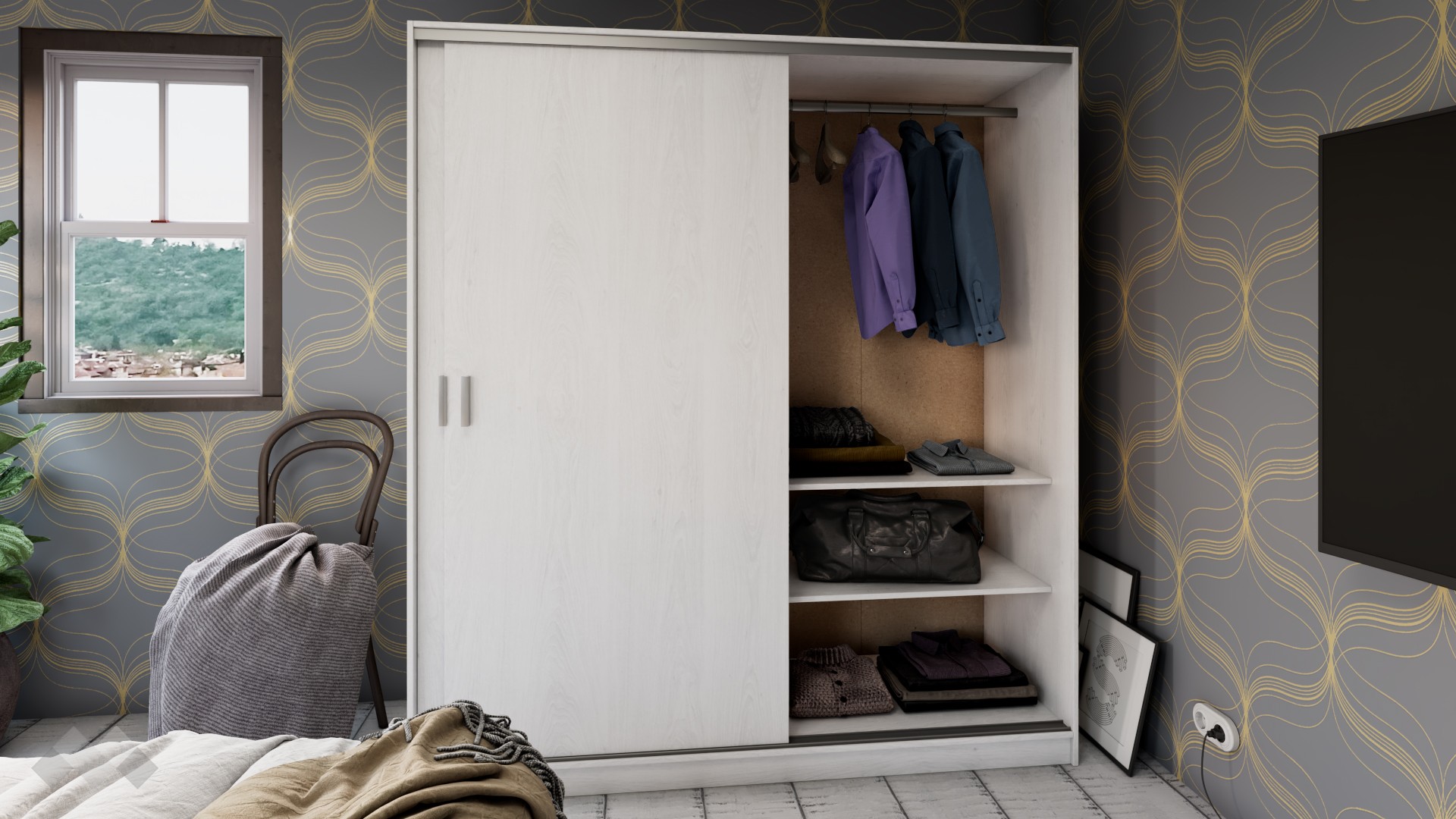 Гардероб Арго е перфектното решение за любителите на мебели със семпъл и изчистен дизайн. Със своите плъзгащи врати и практично вътрешно разпределение, той напълно отговаря на съвременните изисквания за съхранение на дрехи.