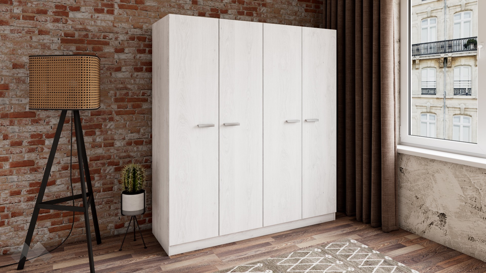 Гардеробът е практично разпределен, изцяло отговарящ на съвременните стандарти за съхранение на дрехи. Вратите се отварят леко и ти дават бърз достъп до всичко – зад две от вратите ще откриеш четири удобно разпределени просторни рафтове, готови да поберат всичките ти дрехи. Не сме забравили и лоста за закачалки, а под него е разположен удобен рафт, където да подредиш аксесоари, кутии за съхранение или други вещи. Така пестиш време и изборът на ежедневен тоалет се превръща в детска игра.