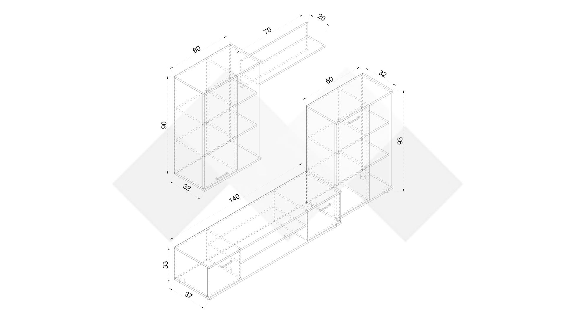 ⭐ Предимства: ✓ модерен декор ✓ ТВ шкаф с широк плот ✓ висок шкаф ✓ окачен шкаф ✓ етажерка ✓ асиметричен дизайн ✓ 16 мм ПДЧ