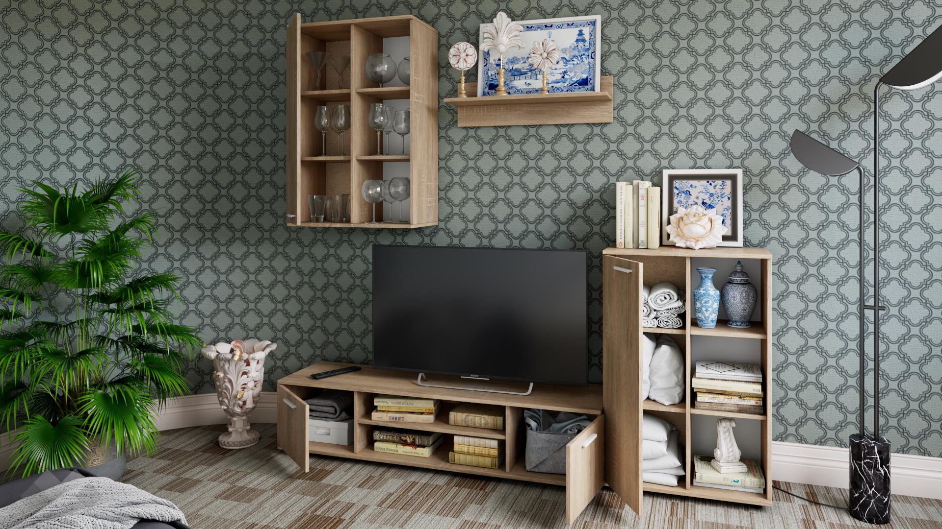 Основата на секцията представлява широк ТВ шкаф с удобен плот, два отворени рафта под него и два шкафа. Там ще откриеш достатъчно място, където да поставиш цялата си съпътстваща техника като ТВ приемници, DVD плейъри и други. До него е поставен висок шкаф с открити рафтове и врата, където с лекота ще аранжираш необходимите ти в ежедневието вещи. Окаченият шкаф също ще ти е от полза – освен да подредиш сувенири, фотоси и декорации, можеш да се възползваш и от закритата част, където да организираш дребни ел. уреди или неща, които да останат скрити от погледите. Към секцията сме добавили и практична етажерка, подходяща за подреждане на книги, скъпи спомени като фотографии или сувенири, а можеш и да аранжираш със стилни декорации и украси – изборът е твой!