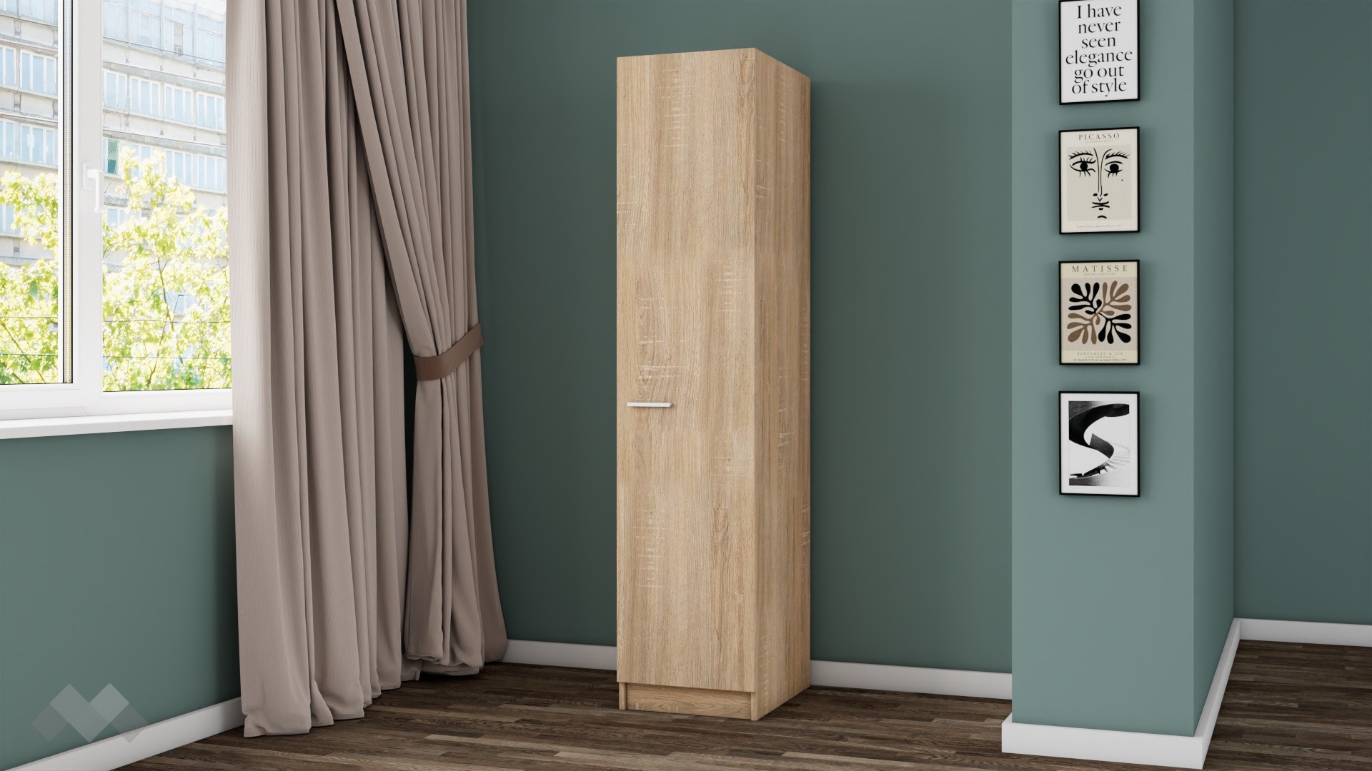 Гардеробът разполага с лост за закачалки, който позволява удобно съхранение на дрехи, нуждаещи се от окачване, като ризи, палта и рокли. Неговата единична врата осигурява лесен достъп до вътрешното пространство, като същевременно спестява място в помещението.