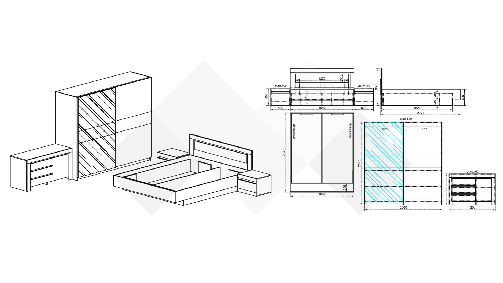 ✓ модерен декор ✓ гардероб с огледало ✓ спалня с нощни шкафчета ✓ скрин ✓ с амортисьорен механизъм ✓ механизъм за плавно затваряне ✓ 16 мм ПДЧ и МДФ