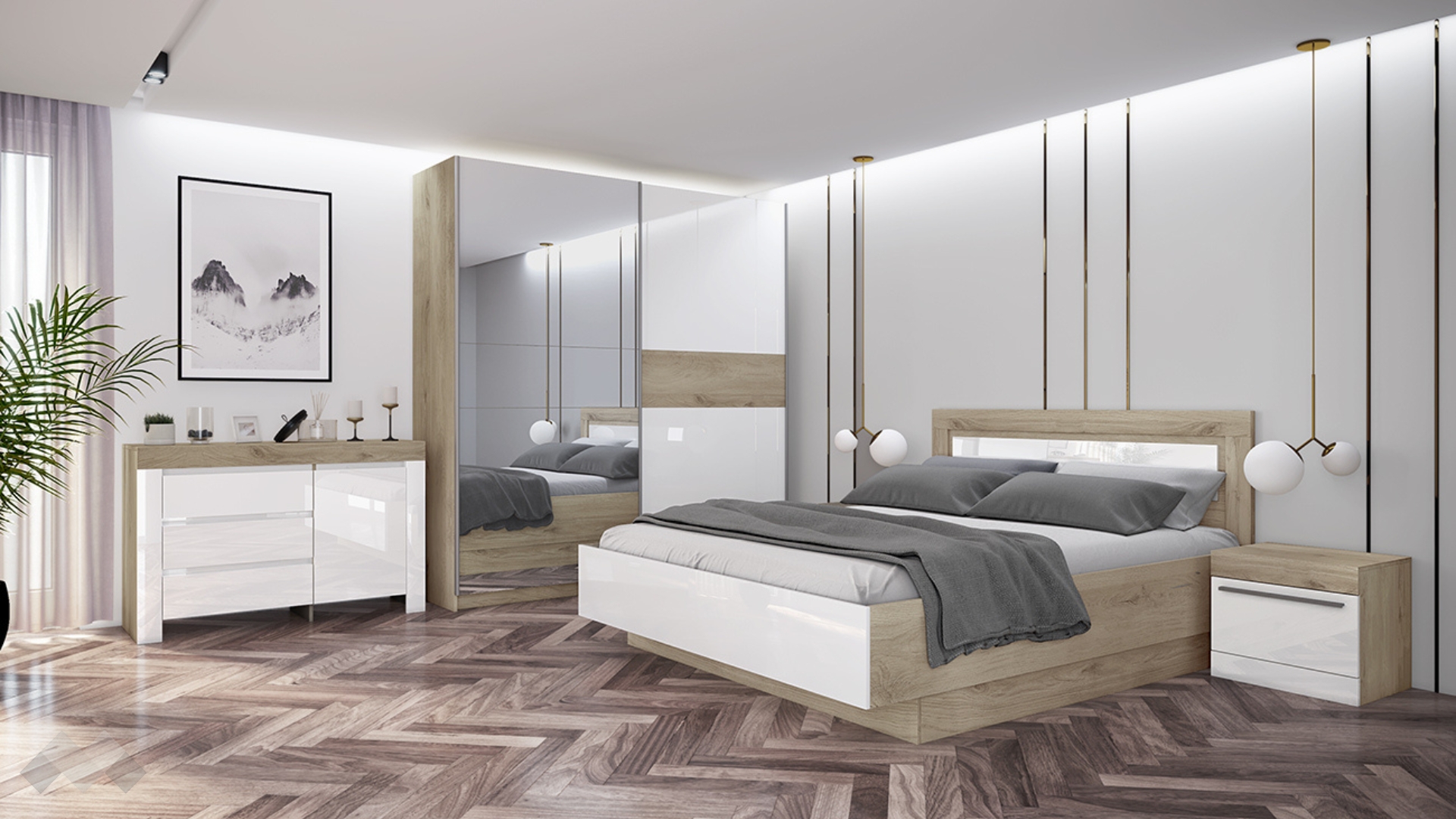 ⭐ Предимства: ✓ модерен декор ✓ гардероб с огледало ✓ спалня с нощни шкафчета ✓ скрин ✓ с амортисьорен механизъм ✓ механизъм за плавно затваряне ✓ 16 мм ПДЧ и МДФ
