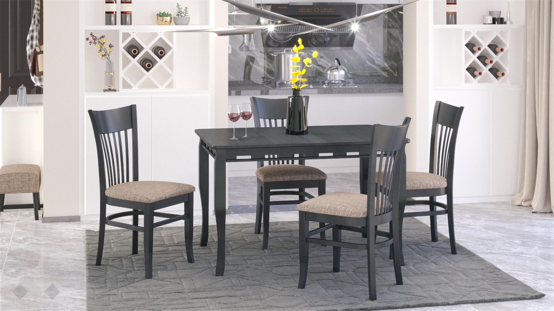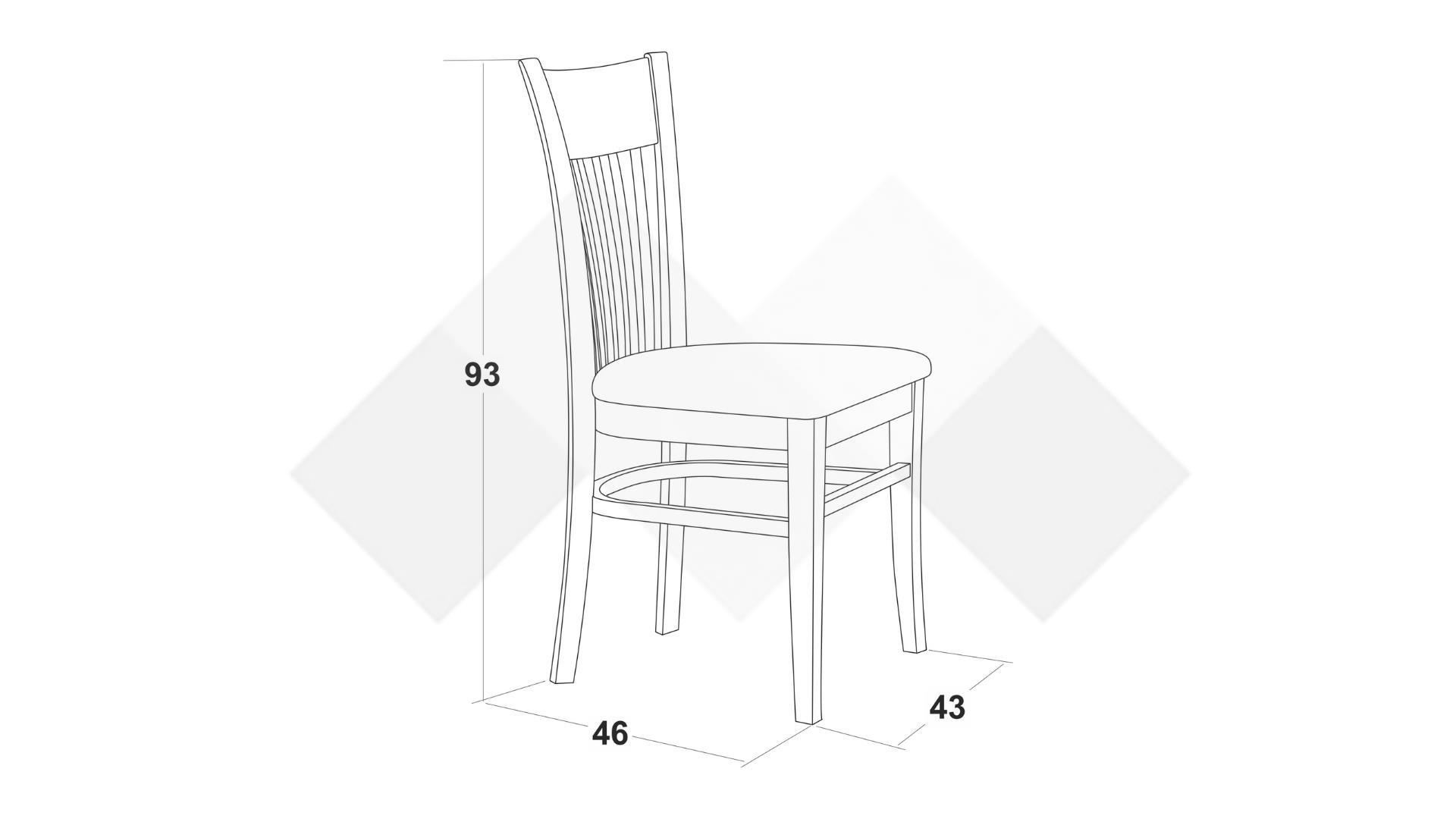 Столът е със здрава конструкция от естествена букова дървесина за устойчивост и стабилност, а лаковото покритие добавя елегантност. Седалката е проектирана с твърда основа, тапицирана с дунапрен за повече комфорт при седене и завършена със здрава текстилна дамаска, лесна за поддръжка.