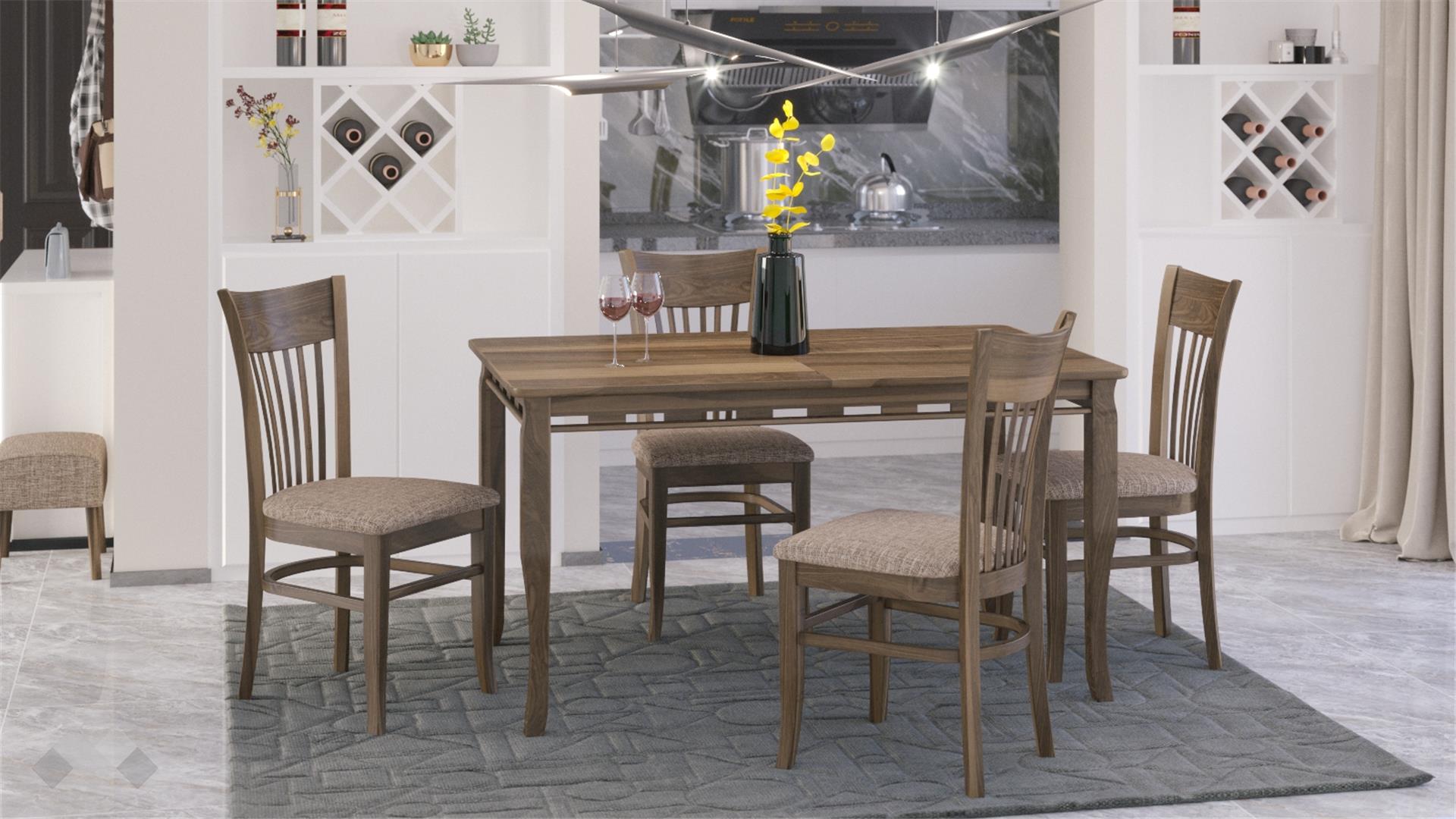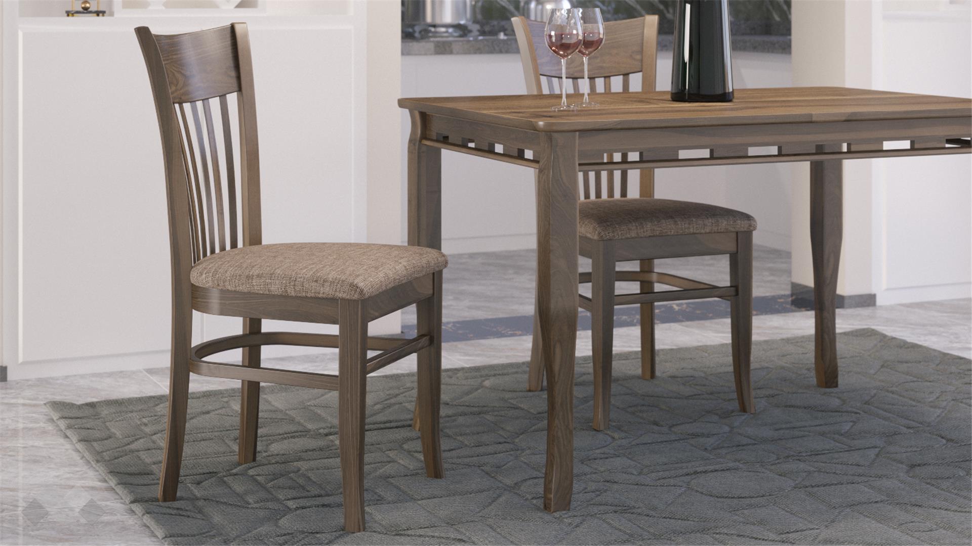 Столът е със здрава конструкция от естествена букова дървесина за устойчивост и стабилност, а лаковото покритие добавя елегантност. Седалката е проектирана с твърда основа, тапицирана с дунапрен за повече комфорт при седене и завършена със здрава текстилна дамаска, лесна за поддръжка.