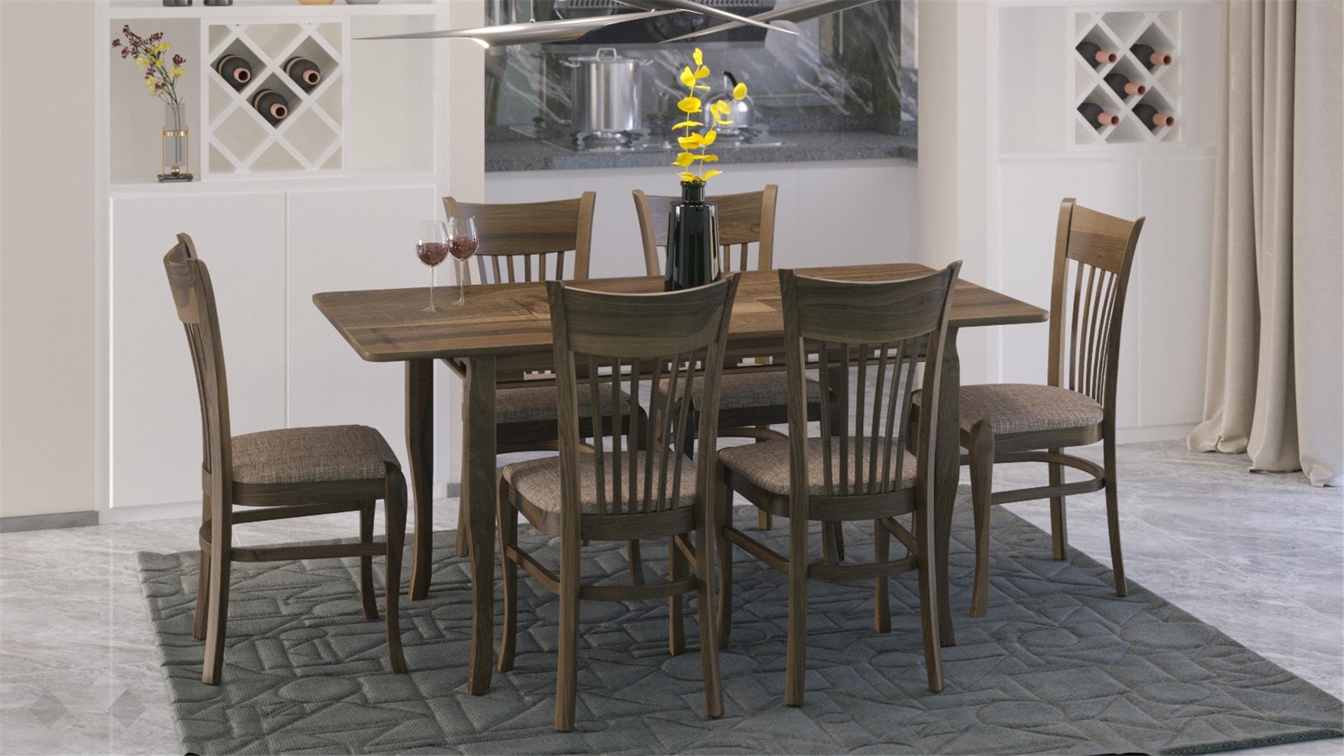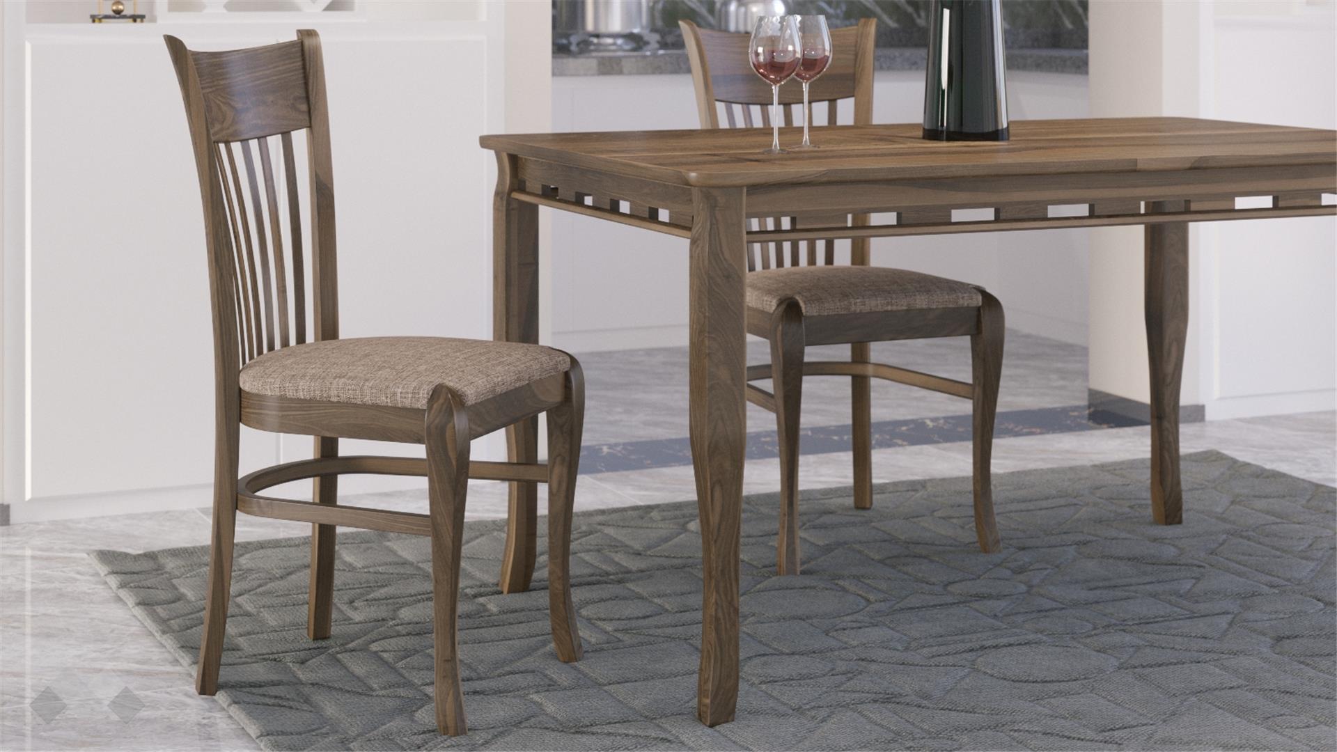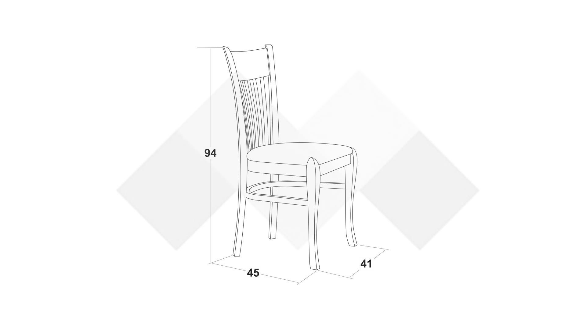 Столът е със здрава конструкция от естествена букова дървесина за устойчивост и стабилност, а лаковото покритие добавя елегантност. Седалката е проектирана с твърда основа, тапицирана с дунапрен за повече комфорт при седене и завършена със здрава текстилна дамаска, лесна за поддръжка.