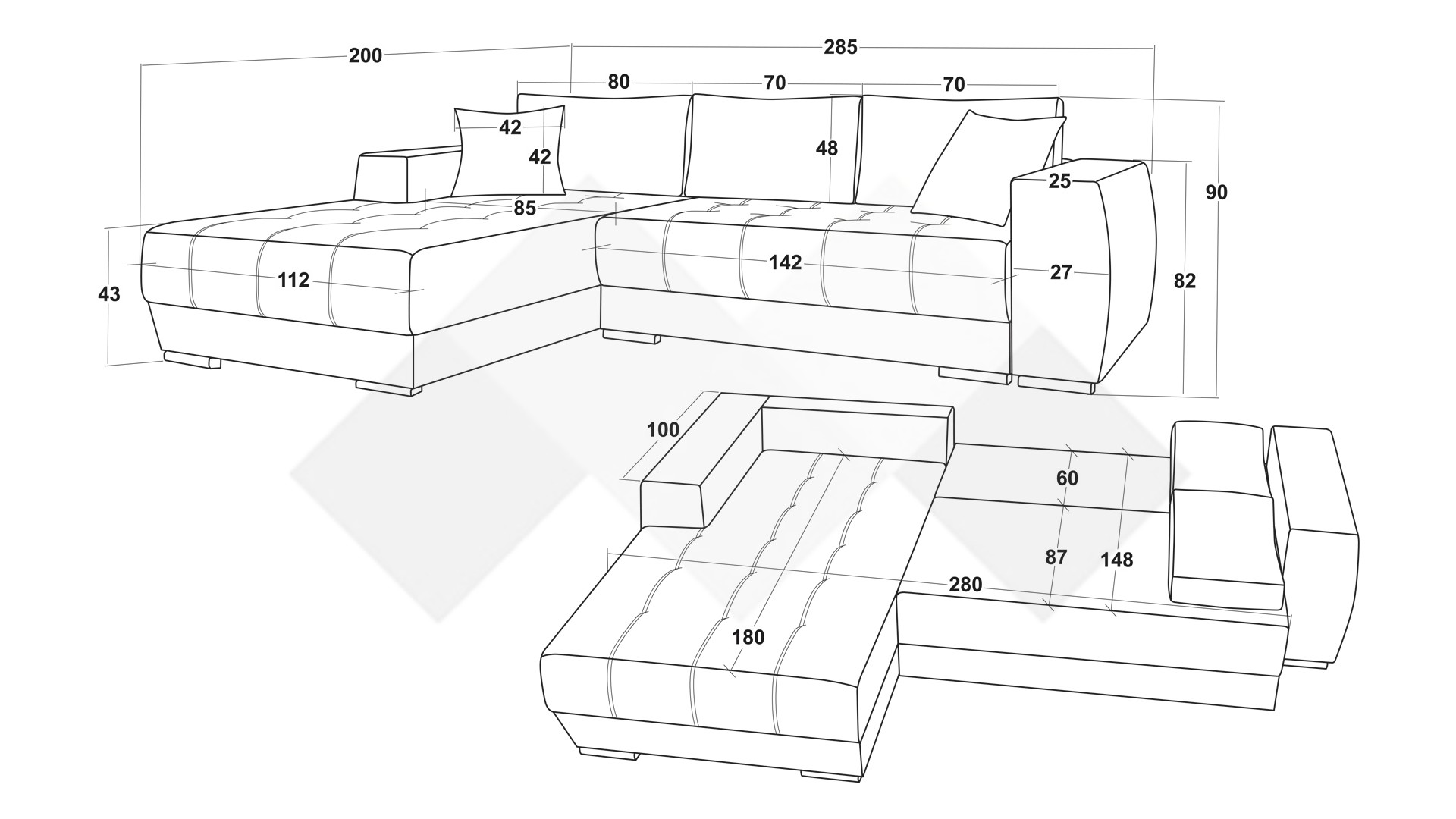 Диванът разполага с три броя големи и два броя по-малки декоративни възглавници, върху които да се отпуснеш след дълъг и уморителен ден. Освен това, има ракла, в която можеш да прибереш възглавници или завивки. Чрез функцията падащ гръб за секунди се превръща в удобно легло с площ за сън 148/280 см.