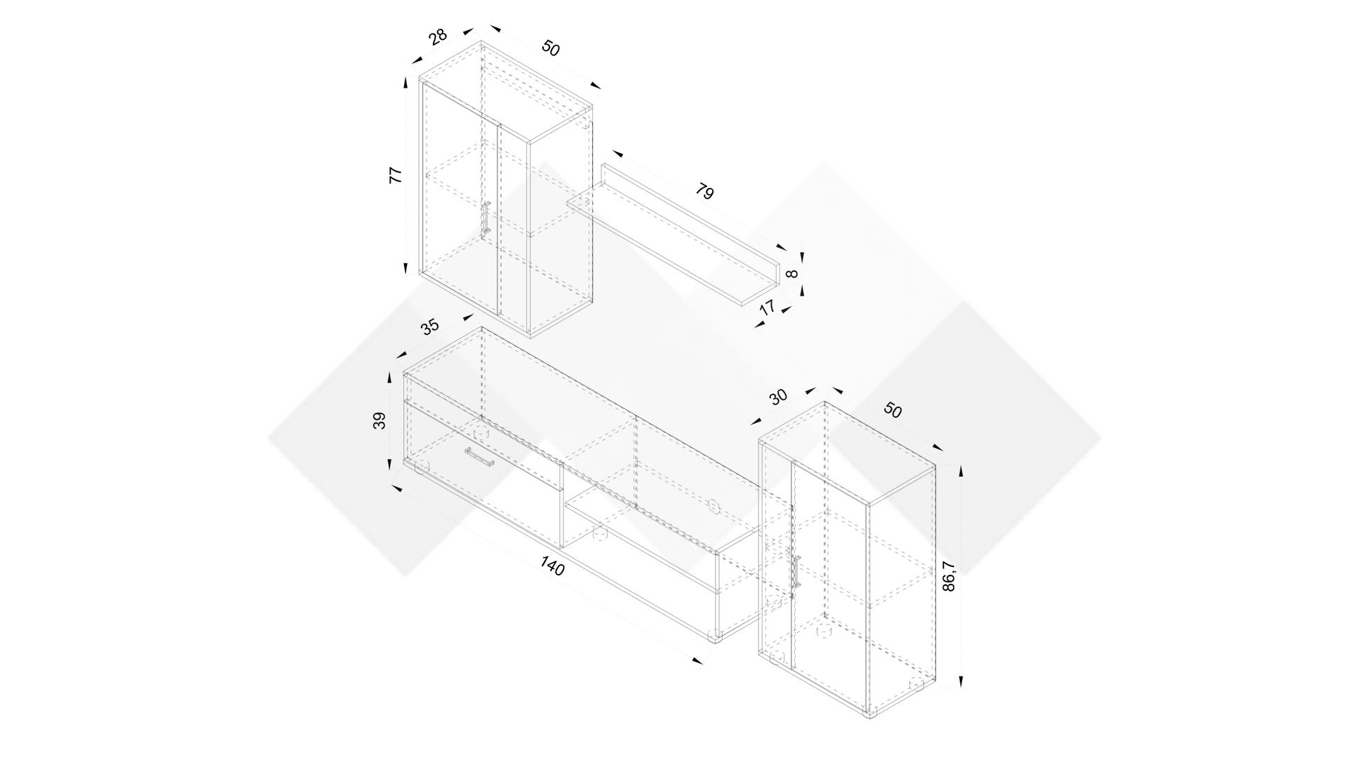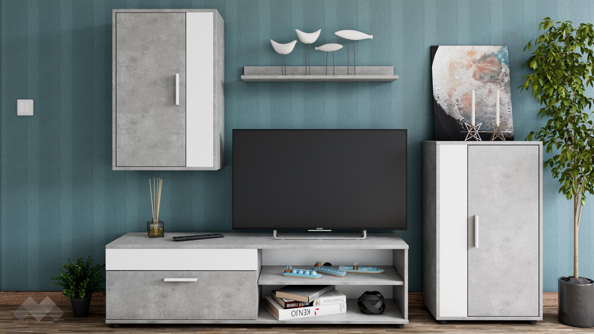 ⭐ Предимства: ✓ 2 отворени рафта ✓ ТВ шкаф ✓ висок шкаф ✓ окачен шкаф ✓ етажерка ✓ модерен дизайн ✓ функционална и практична ✓ качествена изработка ✓ 16 мм ПДЧ