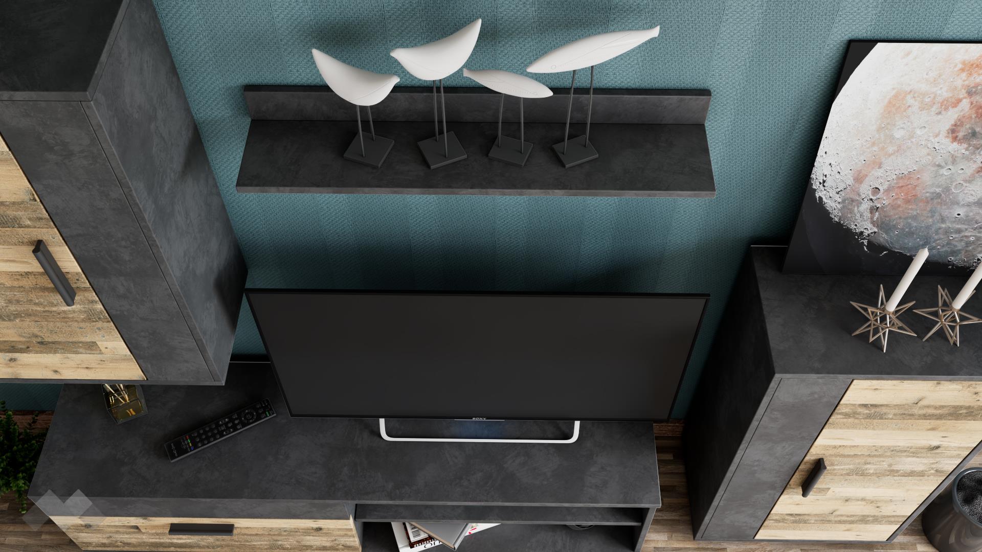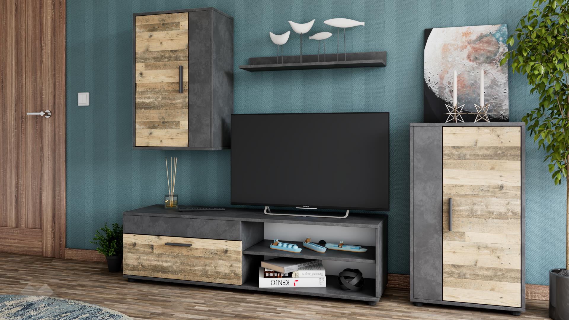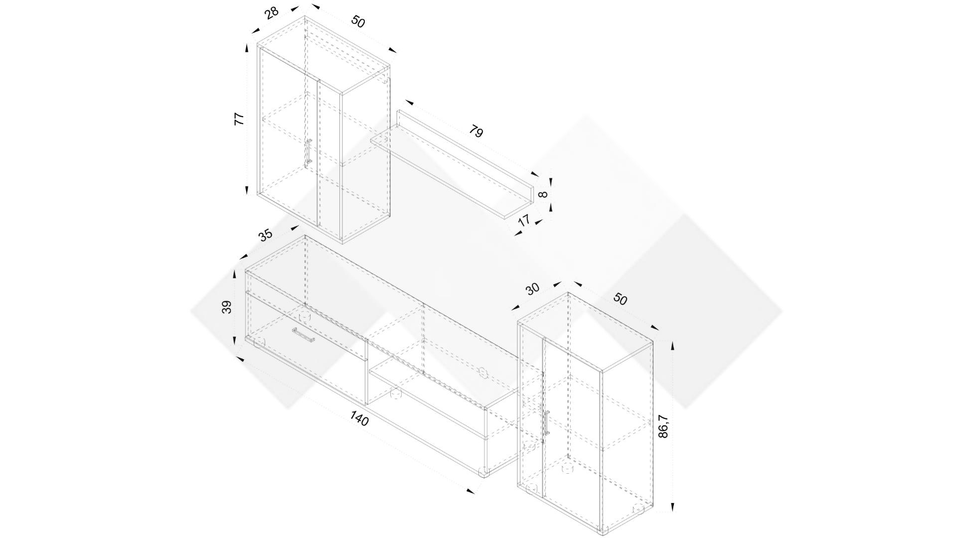 ⭐ Предимства: ✓ 2 отворени рафта ✓ ТВ шкаф ✓ висок шкаф ✓ окачен шкаф ✓ етажерка ✓ модерен дизайн ✓ функционална и практична ✓ качествена изработка ✓ 16 мм ПДЧ