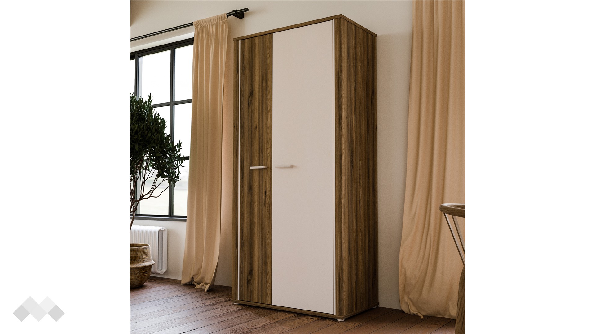 Двукрилен гардероб Дейлос е стилен и практичен избор за твоя дом – с функционално вътрешно разпределение, което осигурява максимално удобство и пространство за съхранение на дрехи и аксесоари. Гардеробът впечатлява със своя изчистен дизайн и ще се впише чудесно във всякакви интериорни стилове.