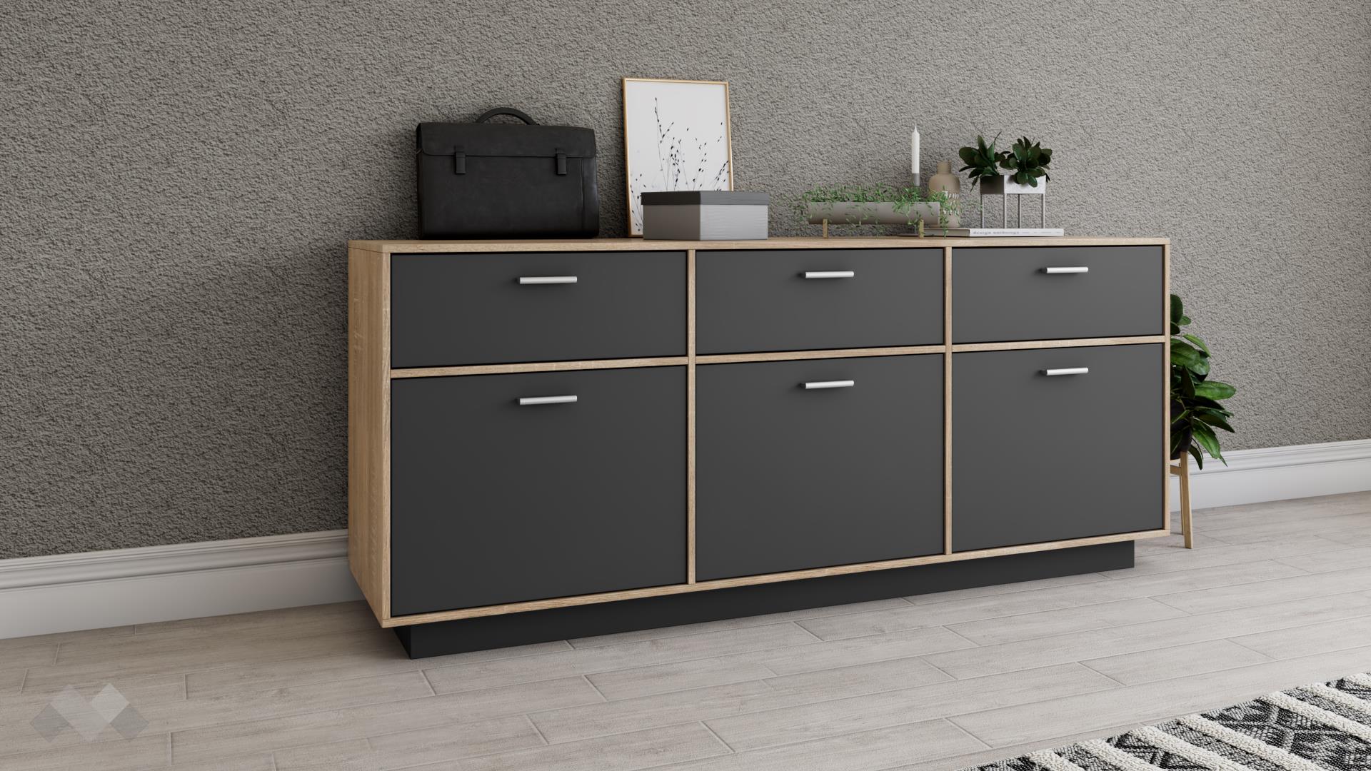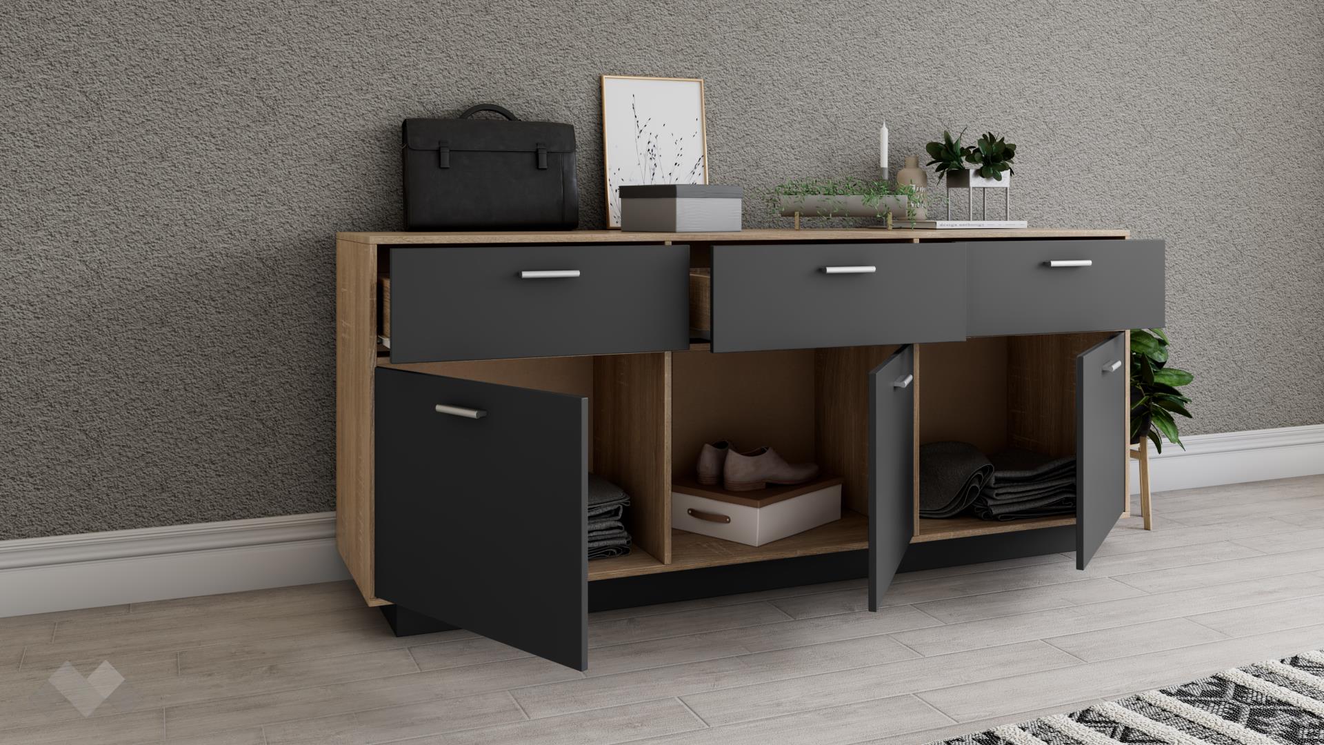 ⭐ Предимства: ✓ 3 чекмеджета ✓ 3 шкафа ✓ компактен и практичен ✓ модерен декор ✓ качествена изработка ✓ 15 мм ПДЧ