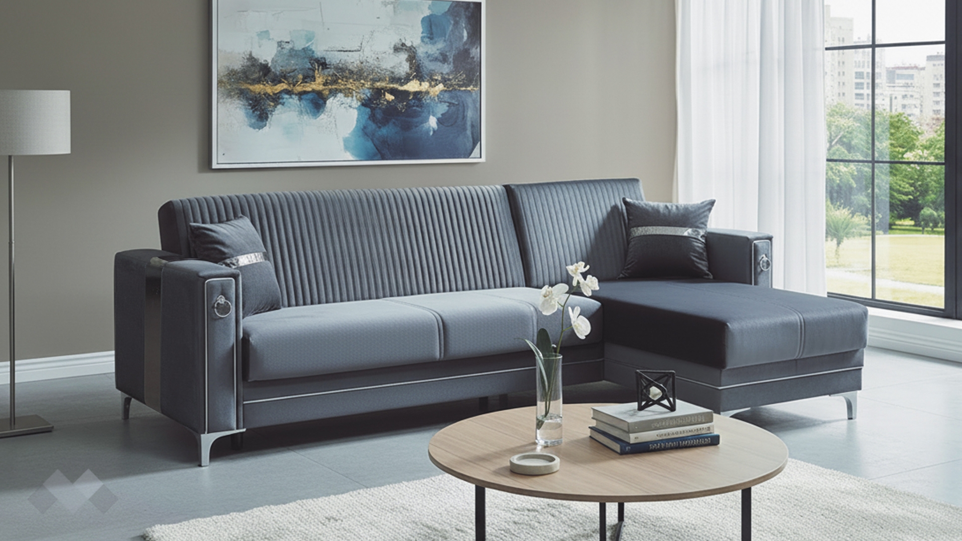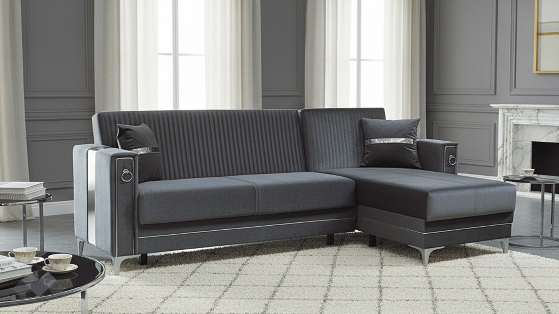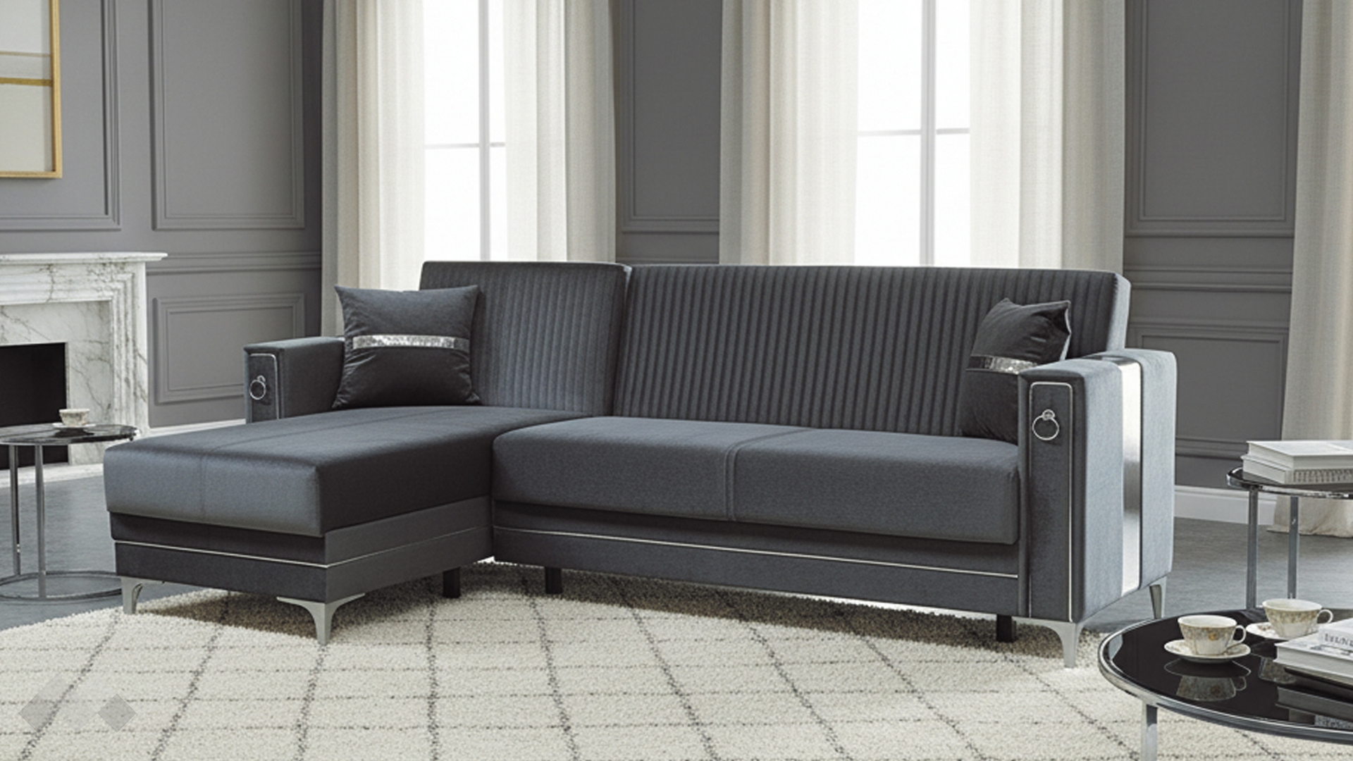 Облегалката е с фини вертикални шевове, които подчертават модерната линия на модела, а подлакътниците са декорирани със сребристи орнаменти, добавящи допълнителен характер и завършен вид. Декоративните възглавнички със сребриста лента допълват усещането за елаганстност, осигуряват повече комфорт и завършват цялостната визия.