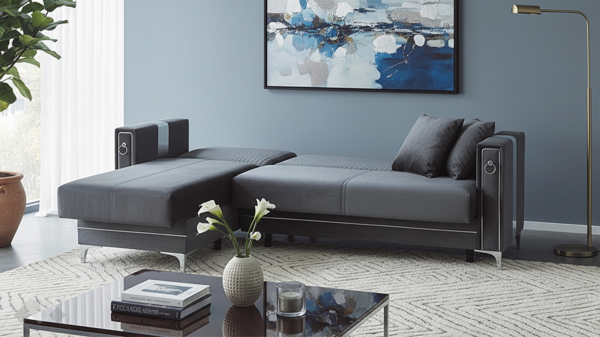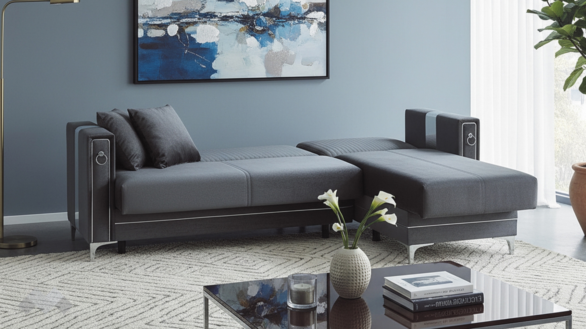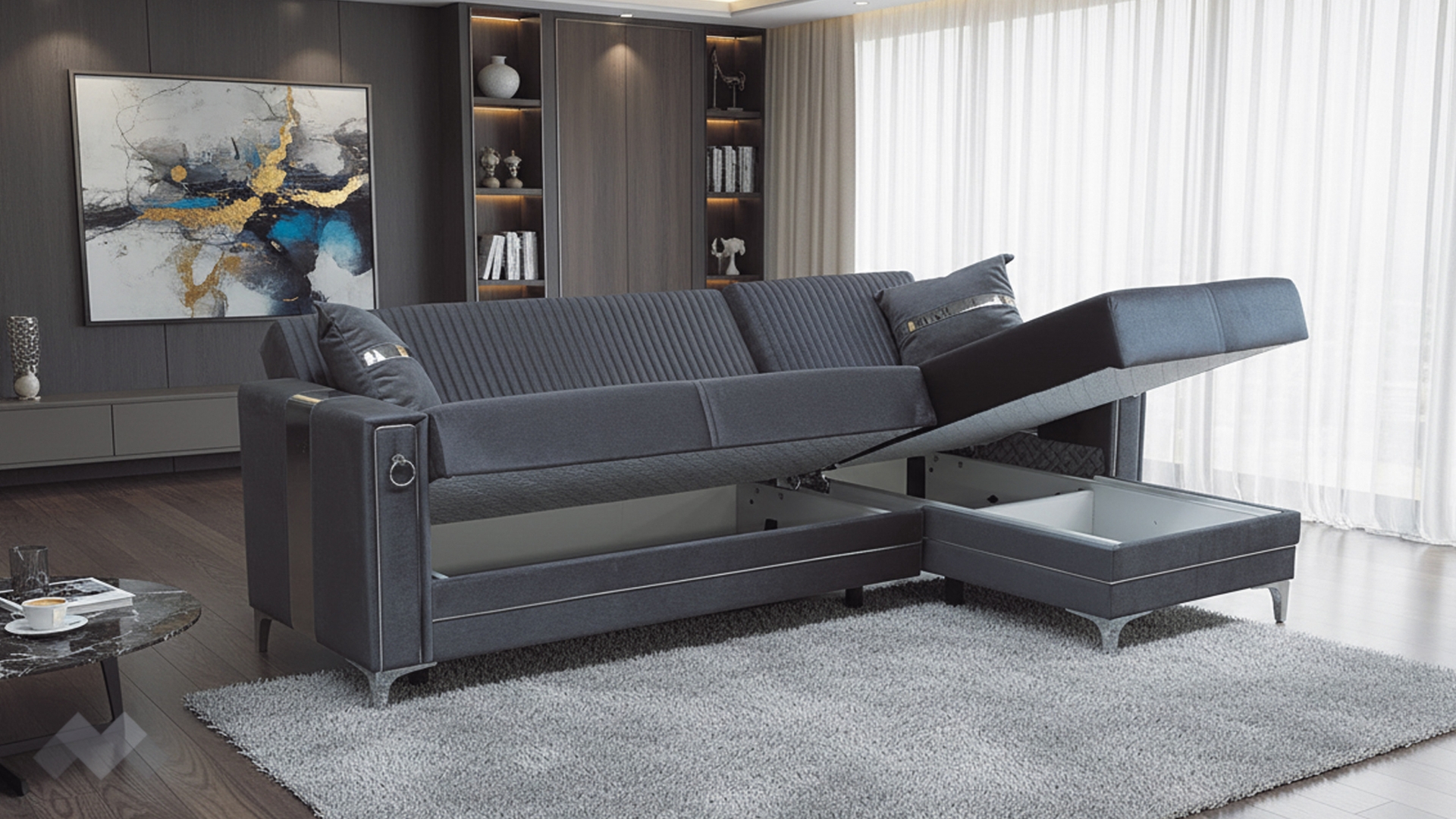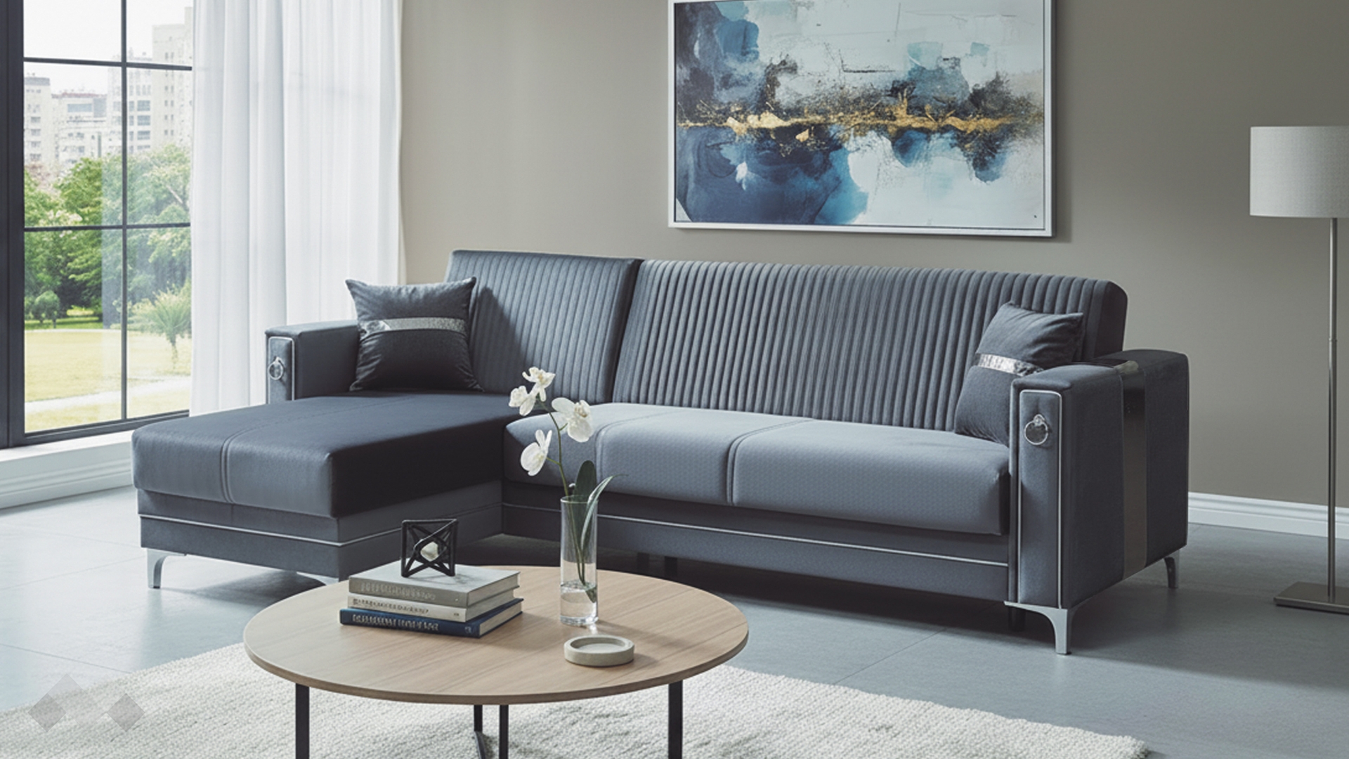 Облегалката е с фини вертикални шевове, които подчертават модерната линия на модела, а подлакътниците са декорирани със сребристи орнаменти, добавящи допълнителен характер и завършен вид. Декоративните възглавнички със сребриста лента допълват усещането за елаганстност, осигуряват повече комфорт и завършват цялостната визия.