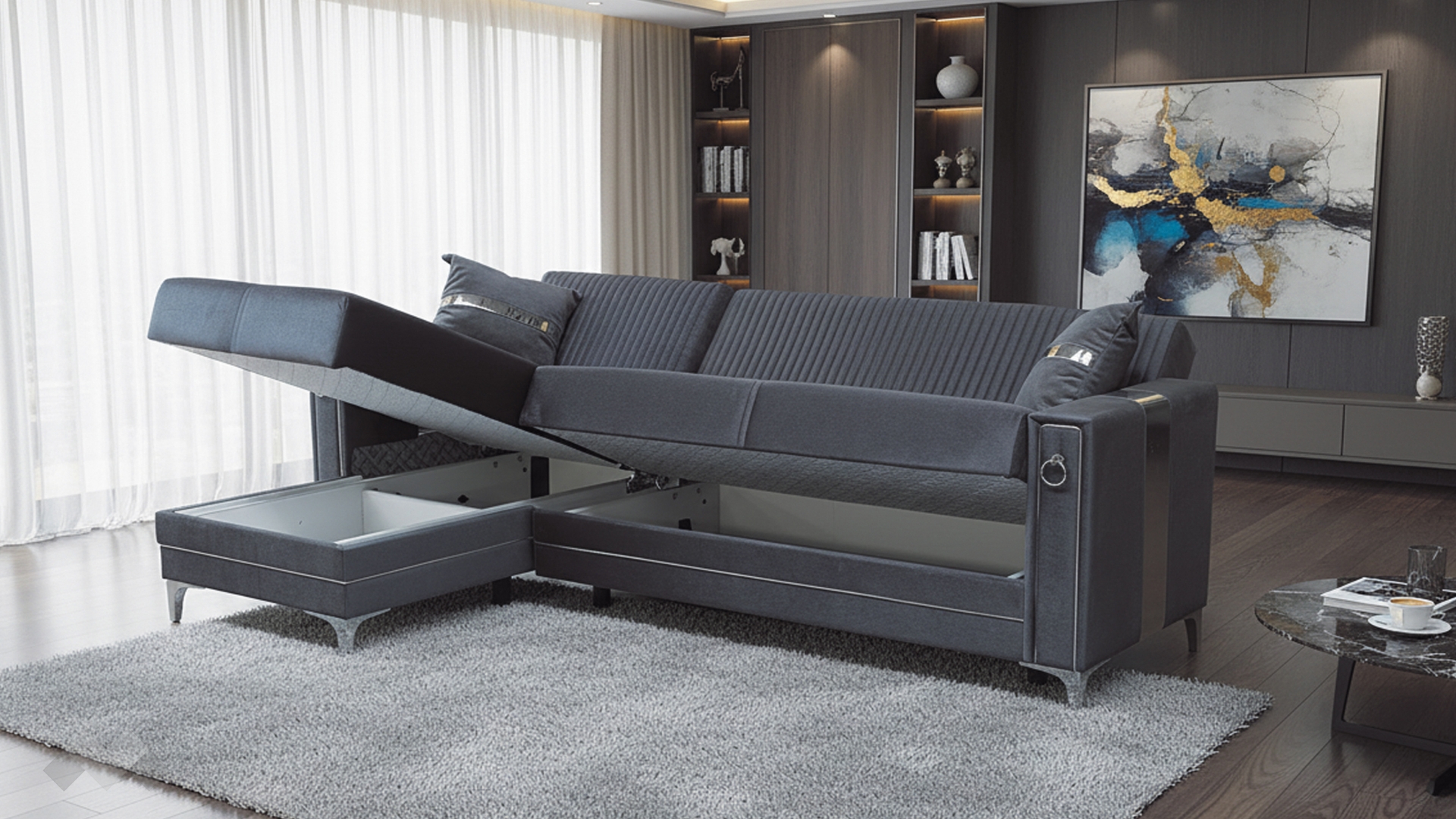 Освен стилен, Ъглов диван Дестини с унивесална посока е и функционален - с минимално усилие се превръща в комфортно и просторно легло с размери 105/210 см, благодарение на клик-клак механизъм. А под лежанката се крие просторна ракла, в която може да съхраниш завивки, още възглавници или вещи, които да са на една ръка разстояние.
