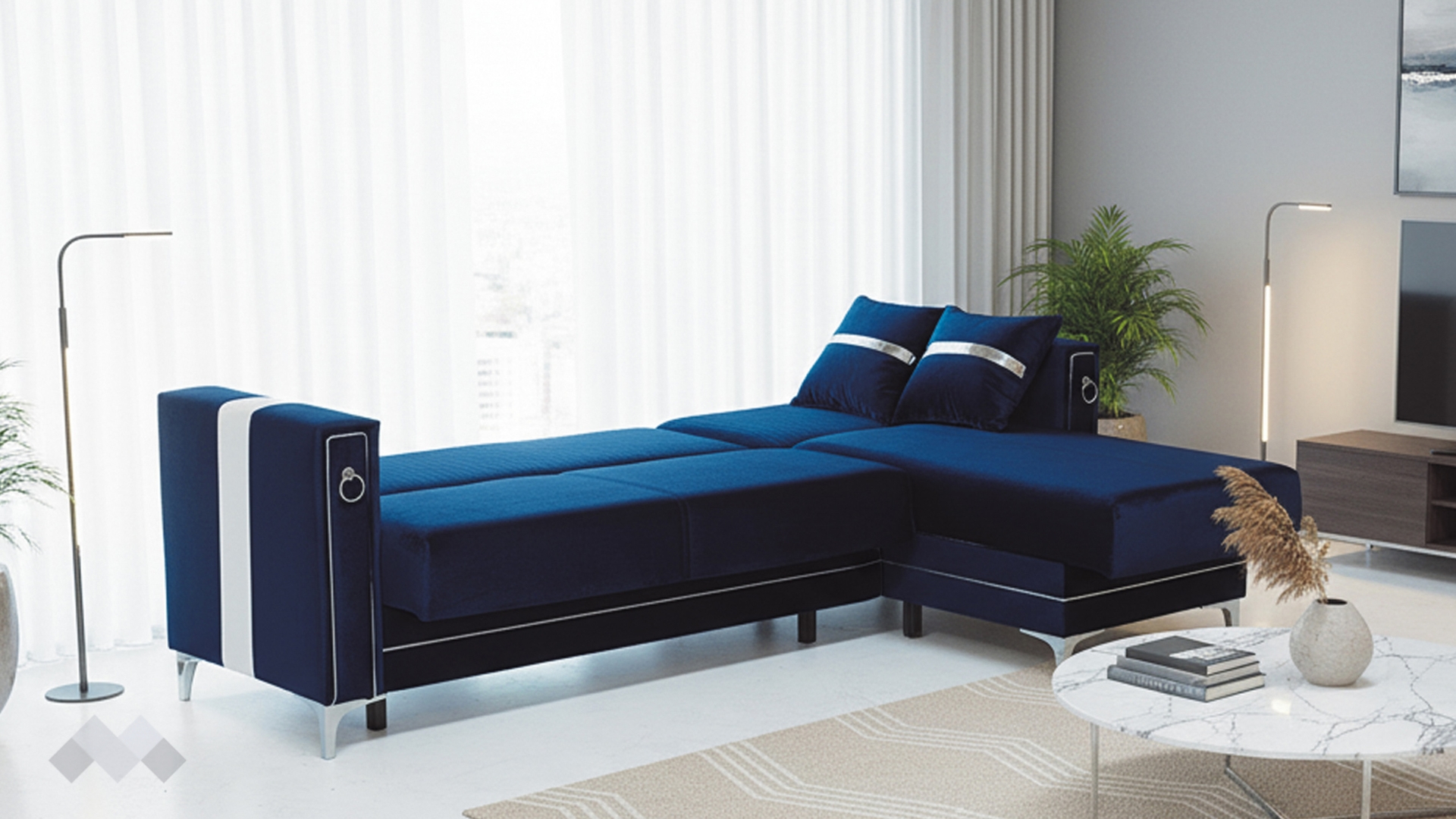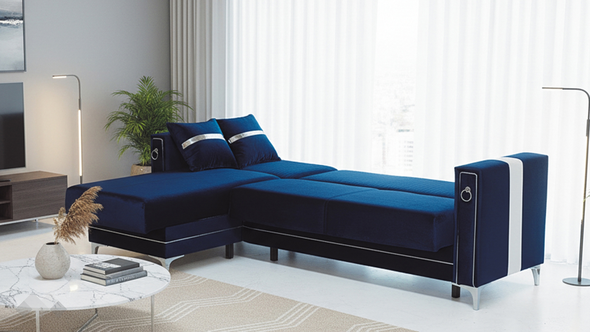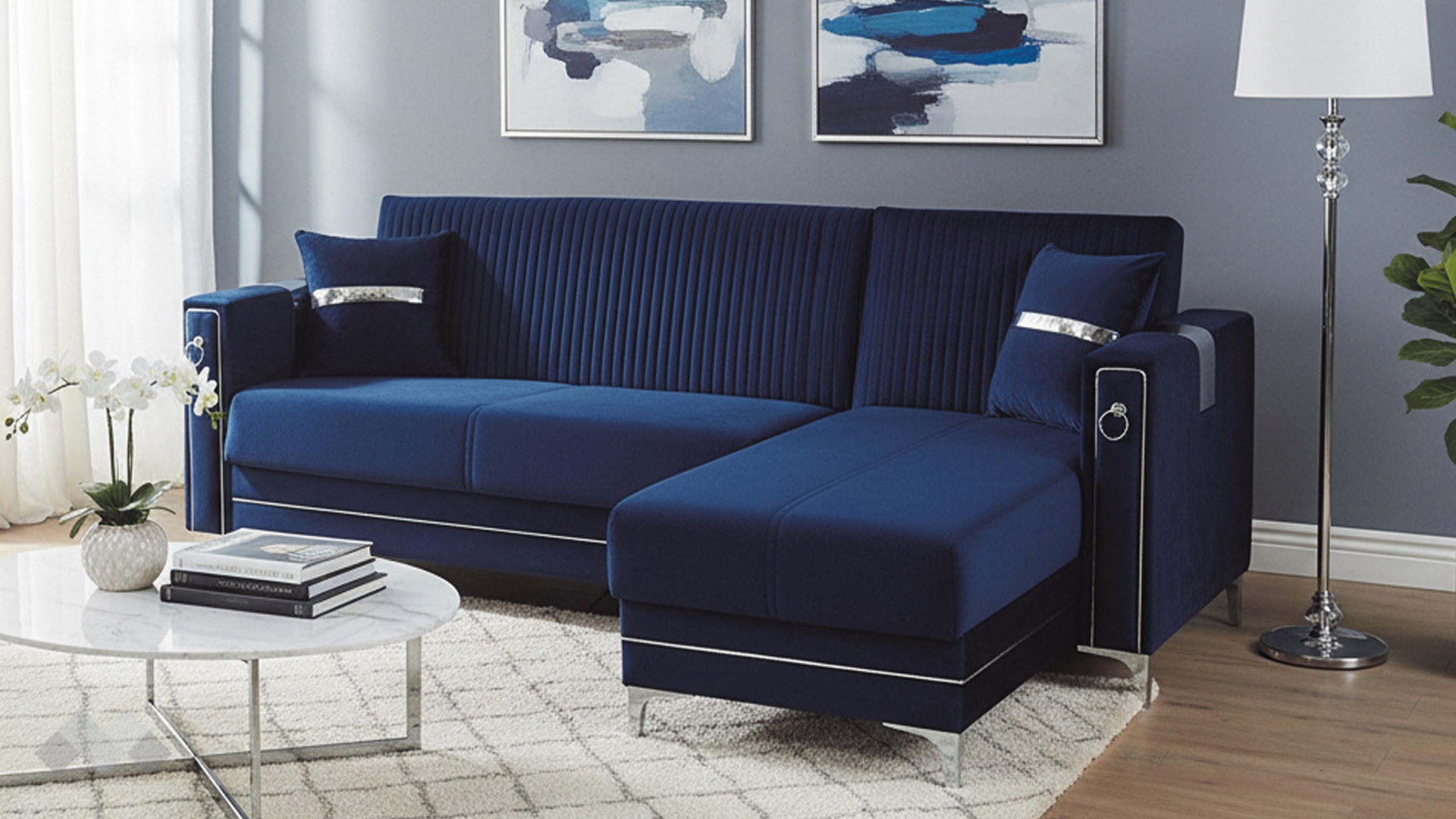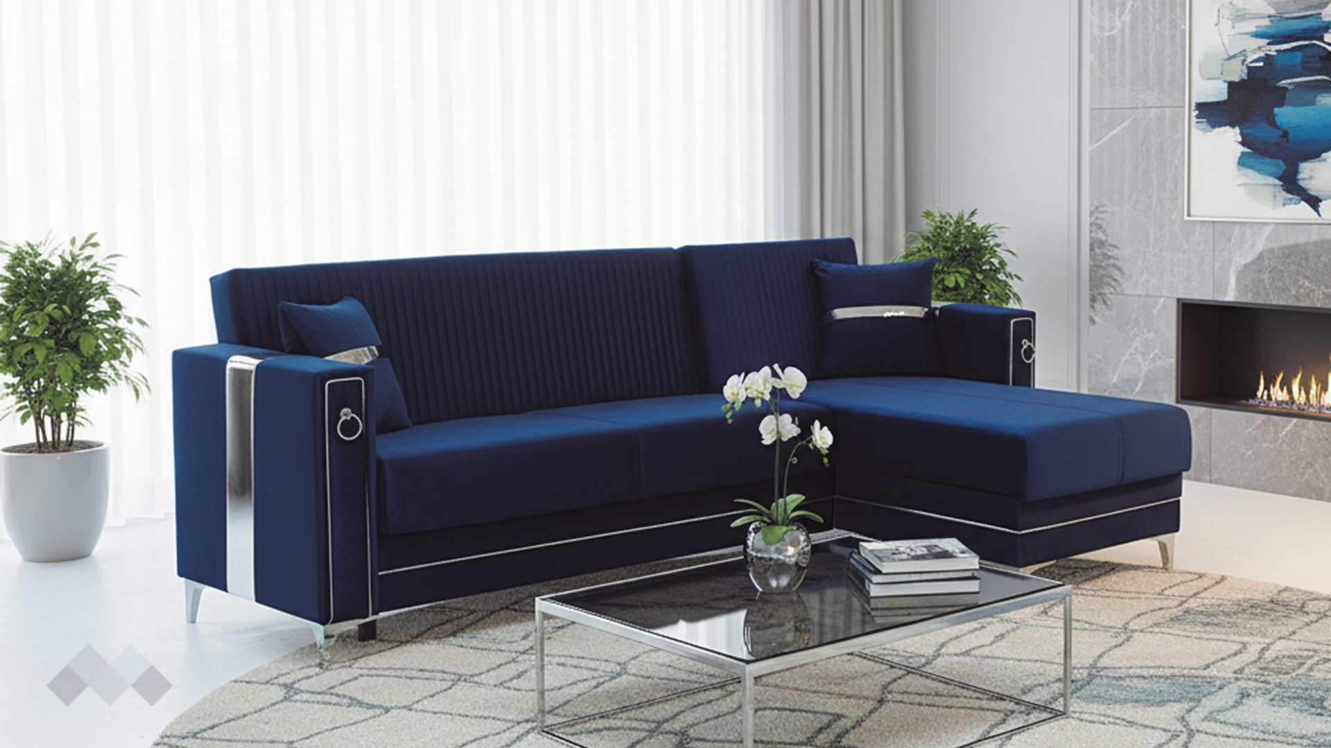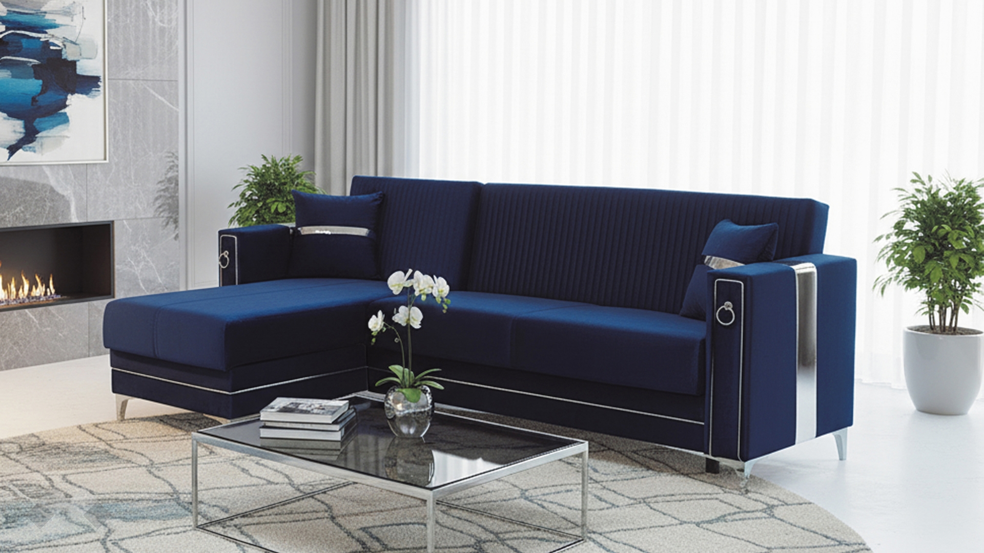 Облегалката е с фини вертикални шевове, които подчертават модерната линия на модела, а подлакътниците са декорирани със сребристи орнаменти, добавящи допълнителен характер и завършен вид. Декоративните възглавнички със сребриста лента допълват усещането за елаганстност, осигуряват повече комфорт и завършват цялостната визия.