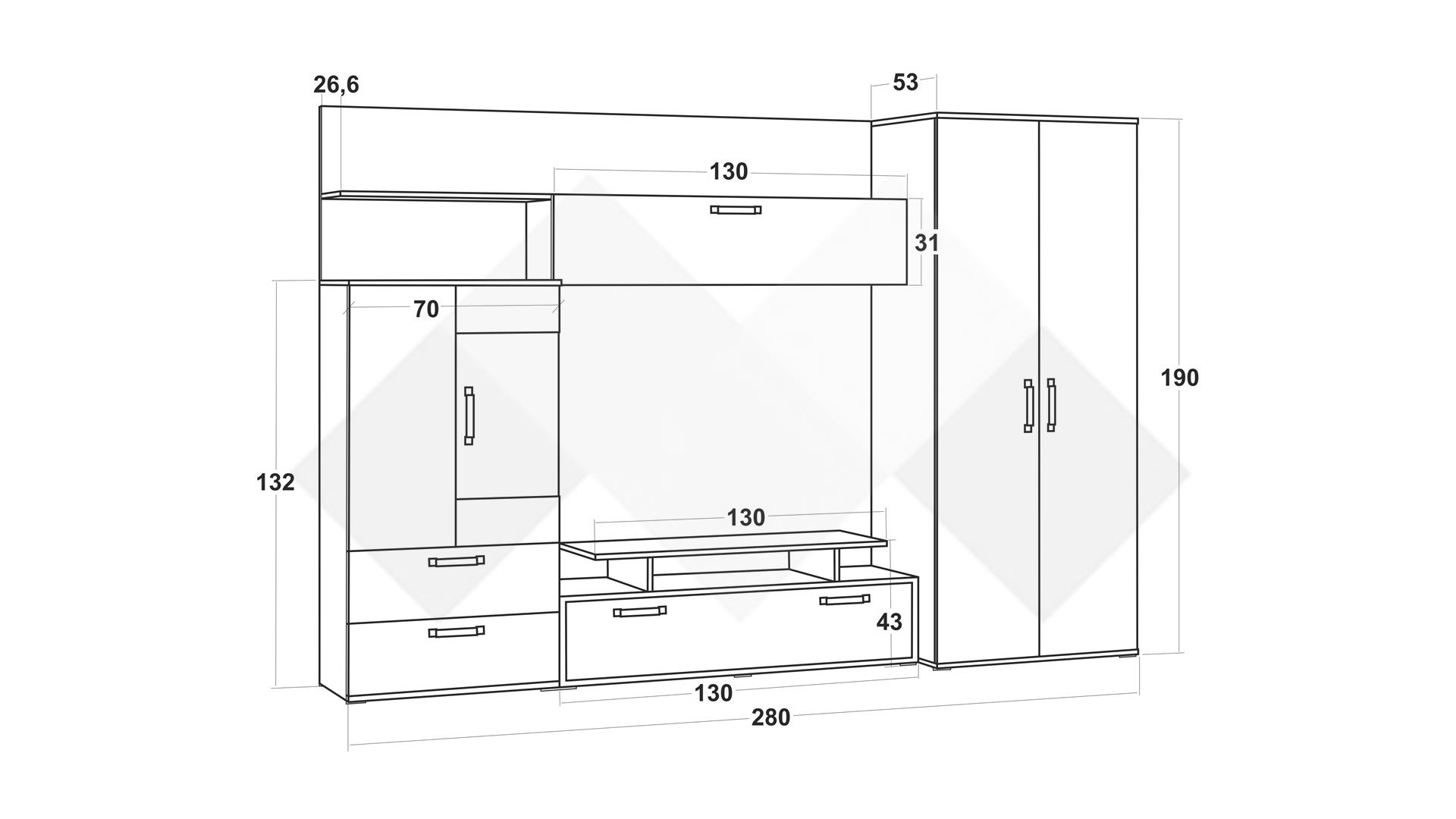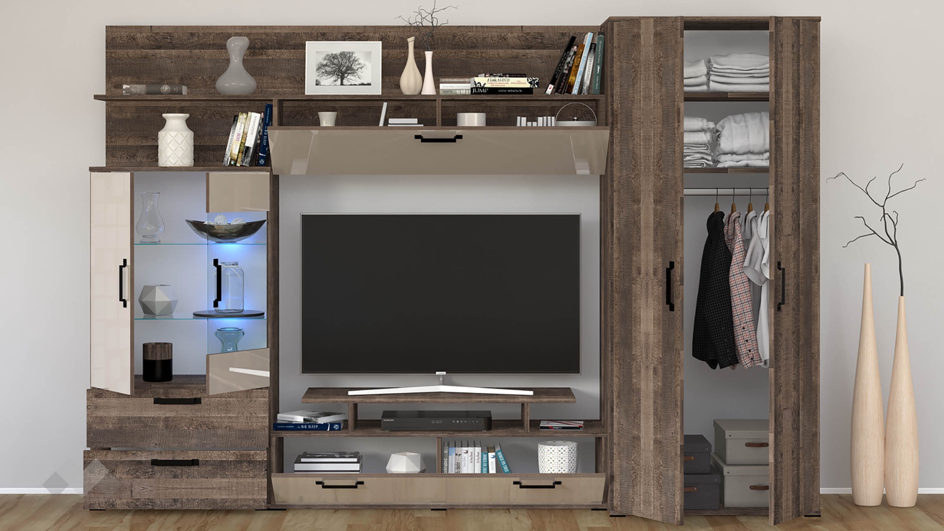 Основата на секцията представлява ТВ шкаф, състоящ се от шкаф с вратичка, отворена ниша и плот. Там можеш да поставиш цялата си съпътстваща техника като ТВ приемници, DVD плейъри или друга техника. Във витрината ще намерят място всичките ти красиви сервизи, любими сувенири или стилни декорации. На твое разположение са два остъклени рафта, на които е монтирано LED осветление, благодарение на което вещите ще засияят. Под витрината разполагаш с две удобни чекмеджета за дребни ел. уреди или други неща, които да останат скрити от погледите. Над мястото за телевизор е позициониран шкаф с падаща врата, където да организираш още полезни за ежедневието вещи. Откритите рафтове са идеални за подреждане на книги, скъпи спомени като фотографии, любими сувенири или други декорации. Двукрилният гардероб разполага с лост за закачалки и два рафта, които ще ти предоставят достатъчно място за дрехи, спално бельо, възглавници и кутии за съхранение.