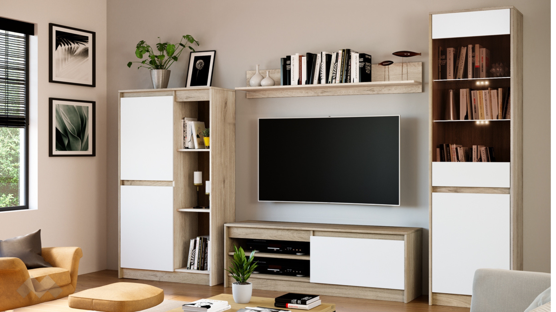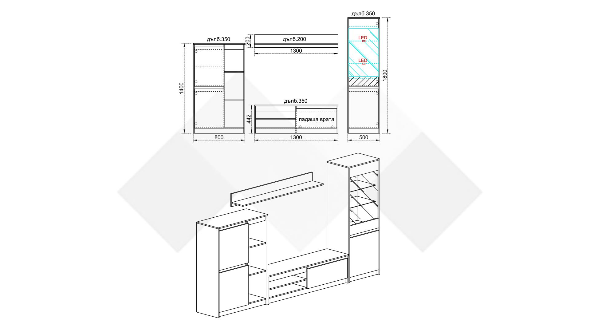 ТВ шкафът ти предлага 2 отворени рафта и шкаф с падаща врата, в него ще намериш място за цялата ти съпътстваща техника. В стъклената витрина можеш да подредиш ценни вещи, които не искаш да остават скрити от погледите, но и ще са на сигурно място. А LED осветлението в нея допълнително ще акцентира върху вещите. Под нея ще намериш обемен шкаф с врата за съхранение на вещи. Високият шкаф разполага с 2 открити рафта и 2 шкафа с вратички. Върху етажерката можеш да подредиш книги, фотографии или стилна декорация – изборът е твой!