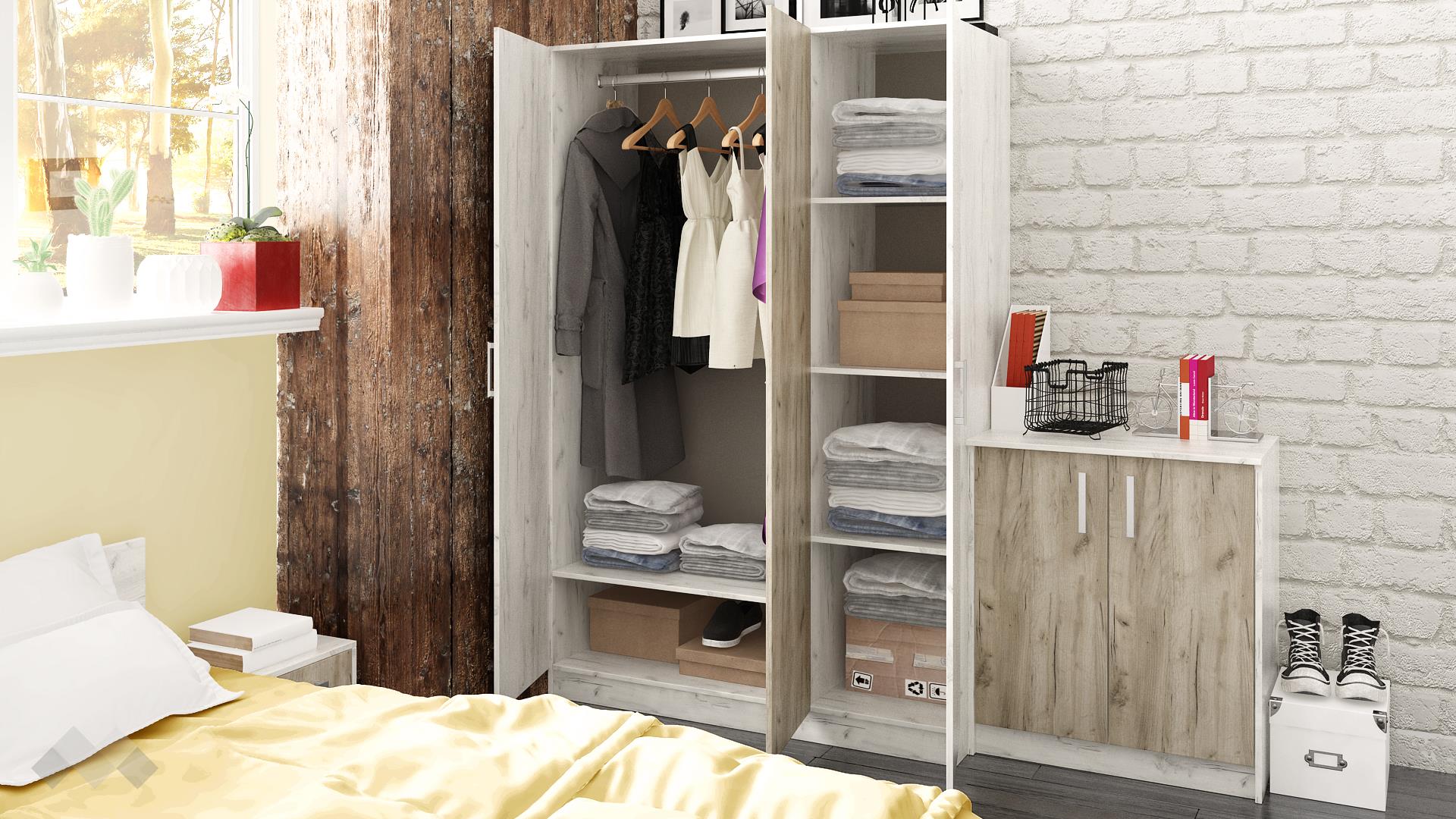 Спален комплект Ентърпрайс ще те грабне със своята практичност и достъпна цена. По фактора практичност, гардеробът може да бъде причислен към спални комплекти от висок клас - разполага с лост за дрехи и цели 4 рафта, за да организираш прилежно своите дрехи.