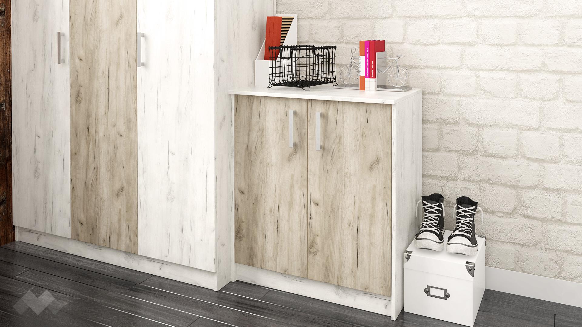 Изработен е от здраво българско ламинирано 16 мм ПДЧ в цветова комбинация дъб крафт сив с дъб крафт бял и се съчетава перфектно с всякакъв интериор.