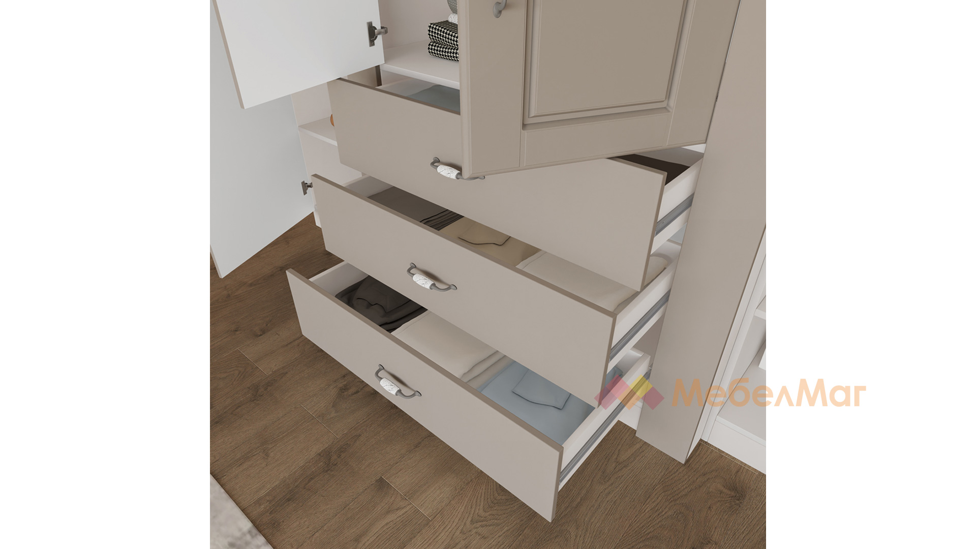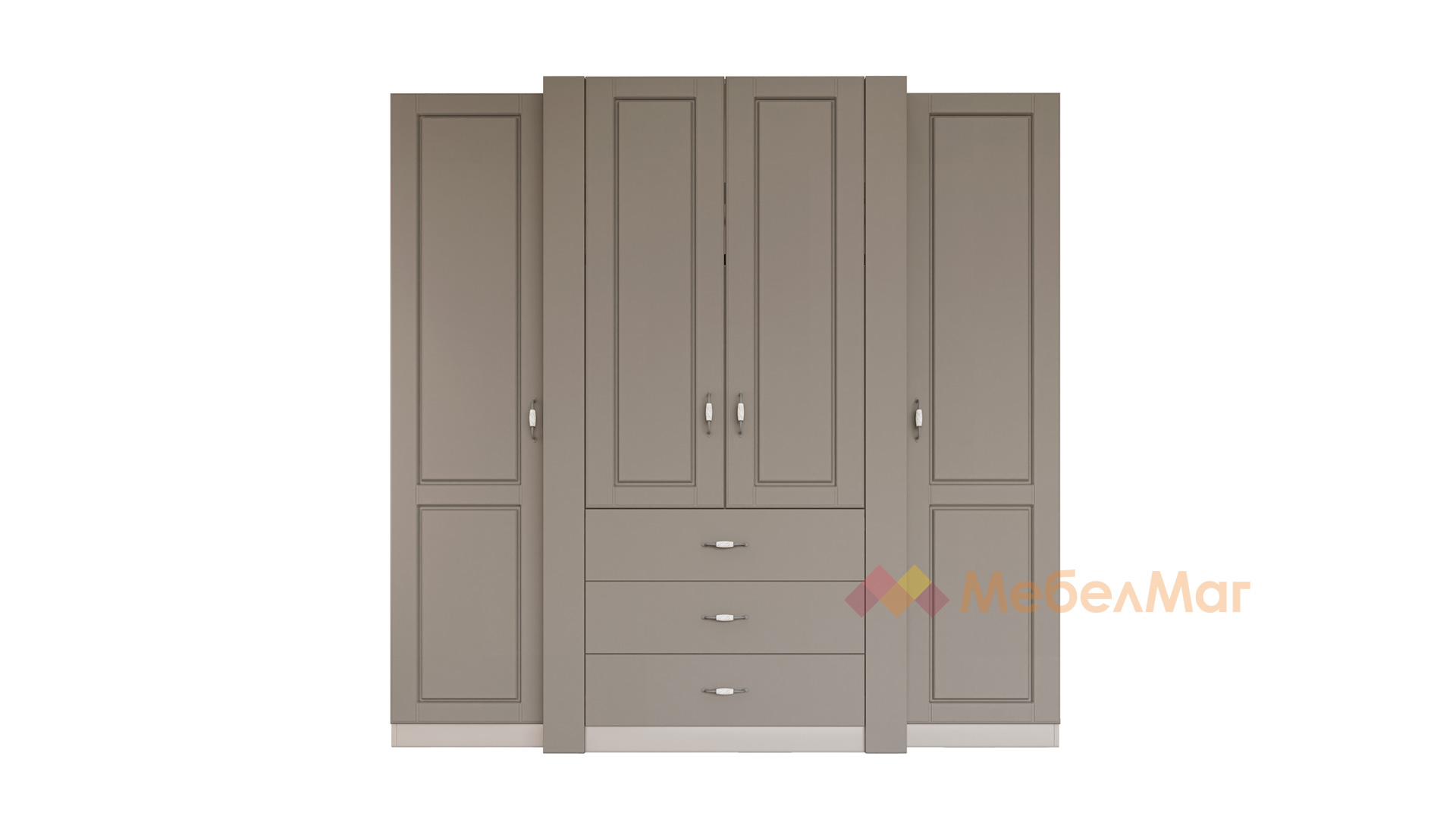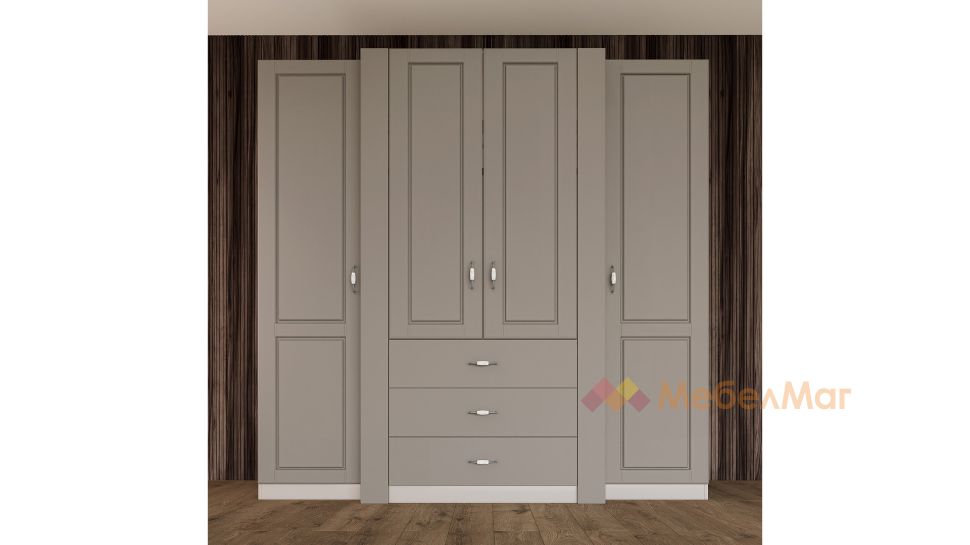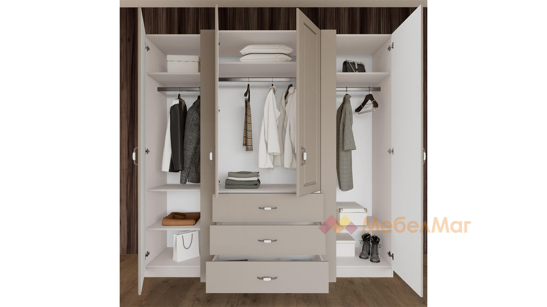 Четирикрилният гардероб ще те впечатли с функционално разпределение, което ще ти позволи да подредиш под конец всички дрехи и аксесоари. На твое разположение са цели девет рафта за организиране на сгънати дрехи, хавлии, завивки, аксесоари и кутии за съхранение. Трите лоста за закачалки ти дават възможността да закачиш прилежно елегантното си облекло като рокли, ризи, сака и връхни дрехи. За още по-голямо удобство разполагаш и с три просторни чекмеджета, подходящи за съхранение на бельо, чорапи или дребни принадлежности.Моделът е с препоръчителен монтаж към стената за по-голяма устойчивост.