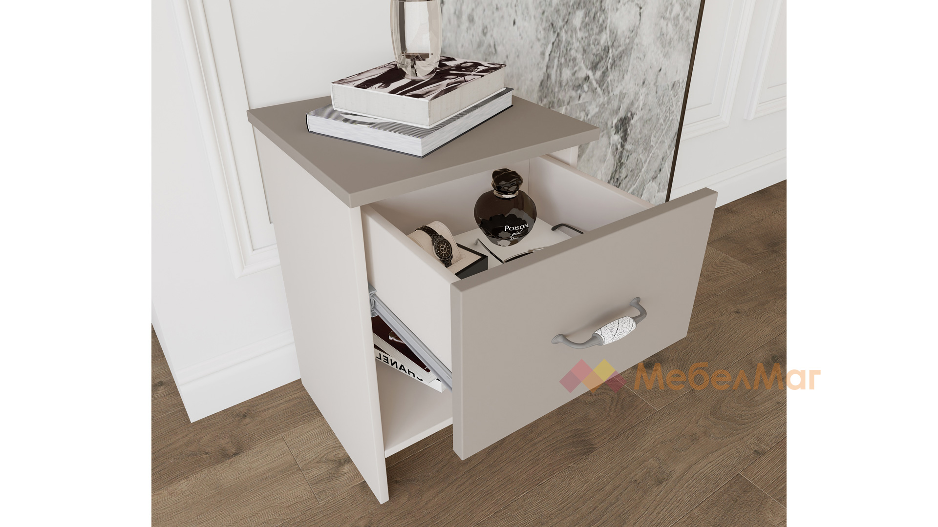 Нощните шкафчета ще организират пространството около спалнята, като ти дадат необходимото пространство за съхранение на личните ти вещи, които искаш да са наблизо до теб преди да заспиш. Те разполагат с чекмедже в горната част и отворен рафт в долната. Чекмеджето е с пълно изтегляне и плавно затваряне, което е още едно предимство.
