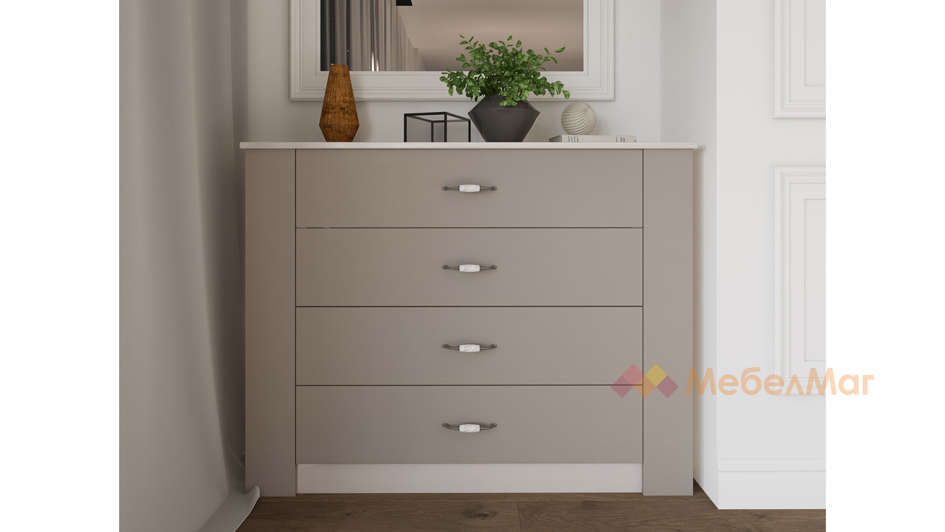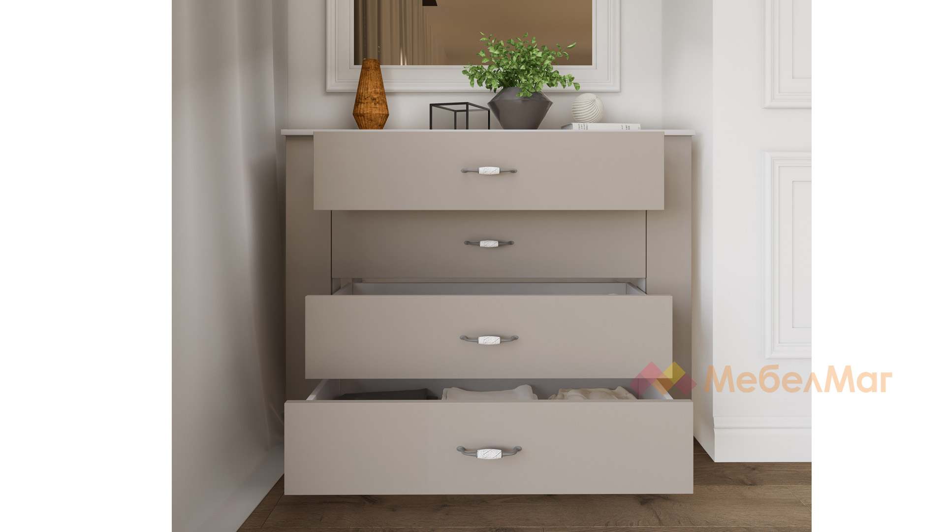 Скринът разполага с четири чекмеджета, което го прави идеалното решение за любителите на подреденият и спретнат дом. В тях спокойно можеш да подредиш всички вещи и дрехи, които искаш да са ти под ръка. Любимите снимки и кокетна декорация ще намерят място върху него, за да придадат още по-голям уют, стил и елегантност в спалнята.