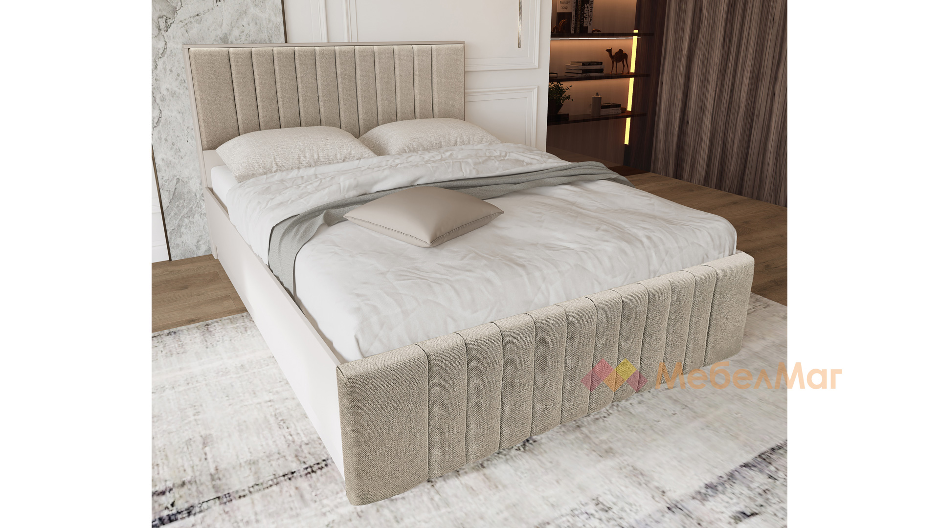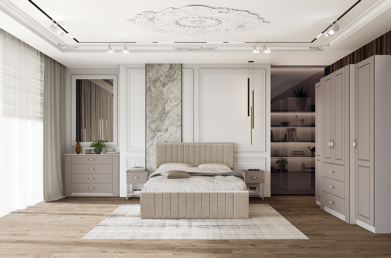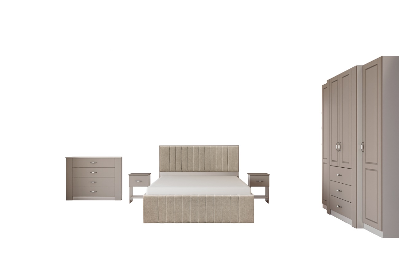 ⭐ Предимства: ✓ тапицирана спалня ✓ четирикрилен гардероб ✓ скрин ✓ 2 нощни шкафчета ✓ повдигащ механизъм ✓ механизъм за плавно затваряне ✓ модерен дизайн ✓ висококачествена изработка ✓ 16 мм ПДЧ ✓ 18 мм МДФ