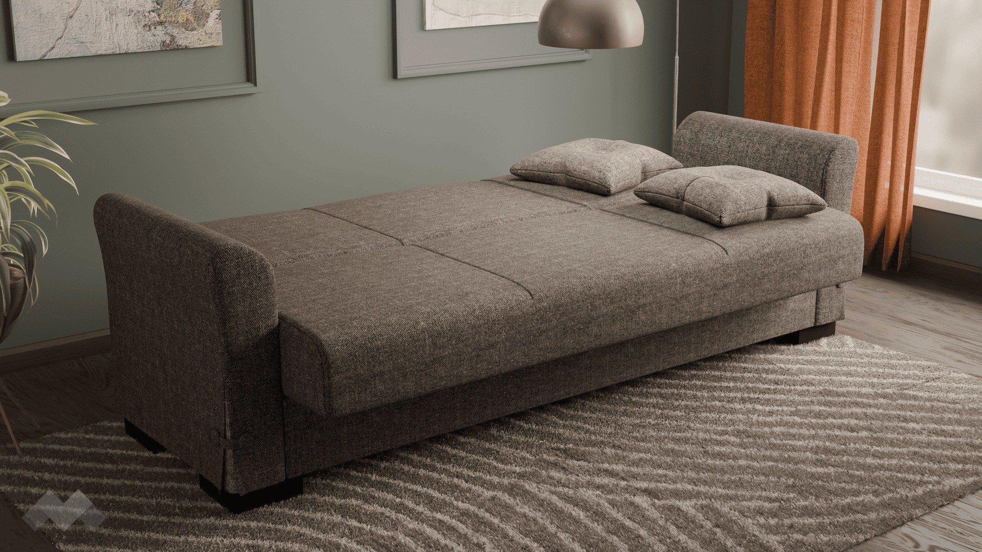 Благодарение на клик-клак механизма, диванът се трансформира бързо и лесно в удобно легло с размери 180/103 см. Само с едно движение можеш да го разгънеш или прибереш, което го прави изключително удобен за ежедневна употреба или за настаняване на гости. Под седалната част ще откриеш още един практичен плюс – удобна ракла, в която можеш да съхраняваш завивки, възглавници и други вещи. Дамаската е приятна на допир, изработена от здрав и устойчив текстил.