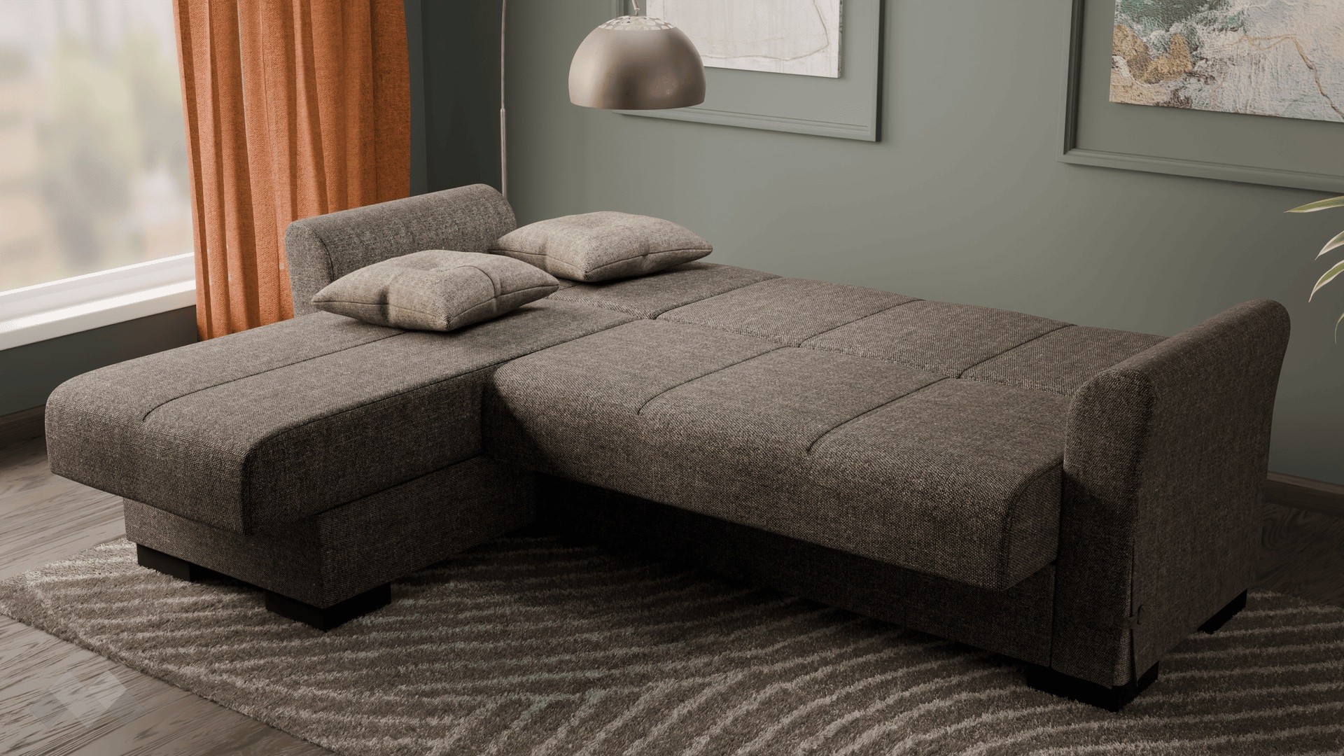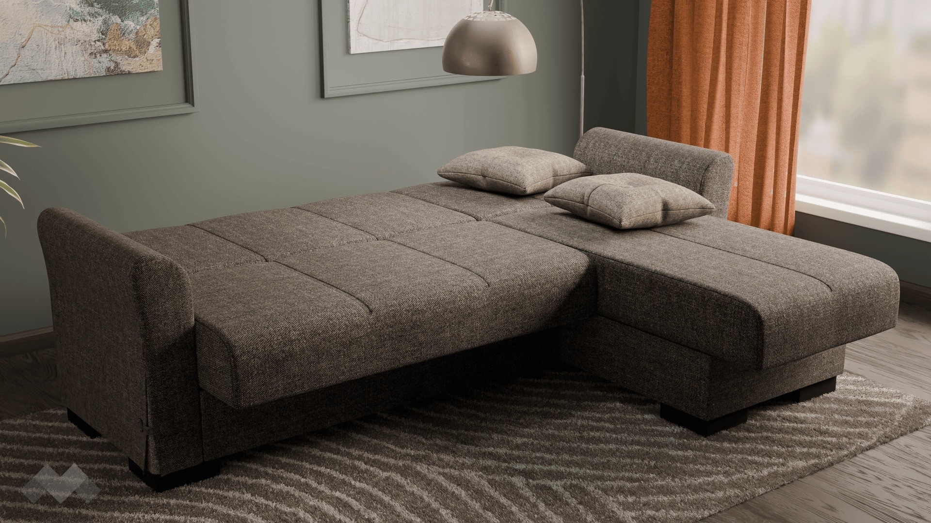 Благодарение на клик-клак механизма, диванът се трансформира бързо и лесно в удобно легло с размери 180/107 см. Само с едно движение можеш да го разгънеш или прибереш, което го прави изключително удобен за ежедневна употреба или за настаняване на гости. Под седалната част и под лежанката ще откриеш още един практичен плюс – удобни ракли, в които можеш да съхраняваш завивки, възглавници и други вещи. Дамаската е приятна на допир, изработена от здрав и устойчив текстил.