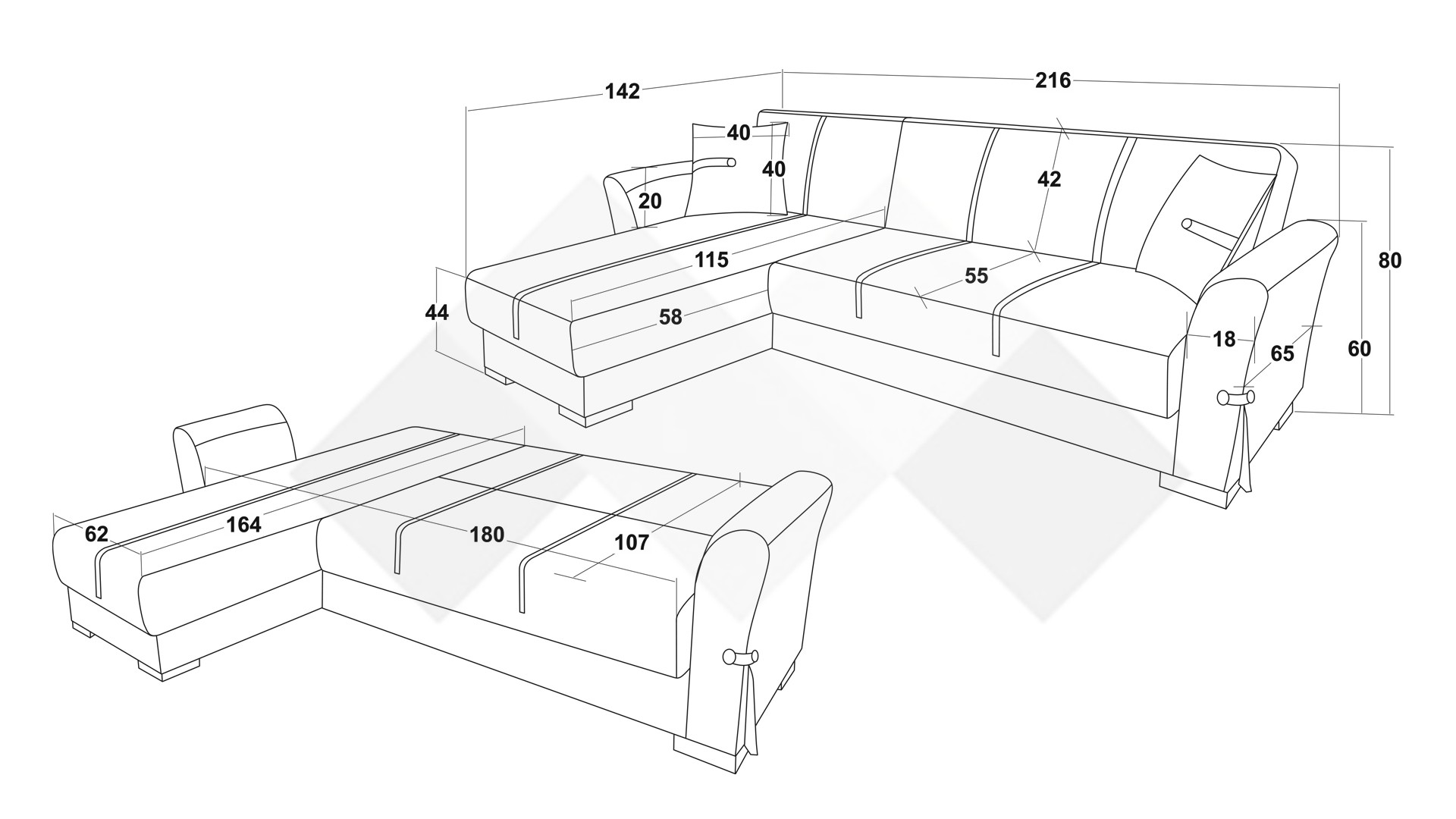 Конструкцията на ъгловия диван е изработена от комбинация от масивна дървесина, ПДЧ, метал и Бонел пружина, която гарантира дълготрайна стабилност и издръжливост на модела.