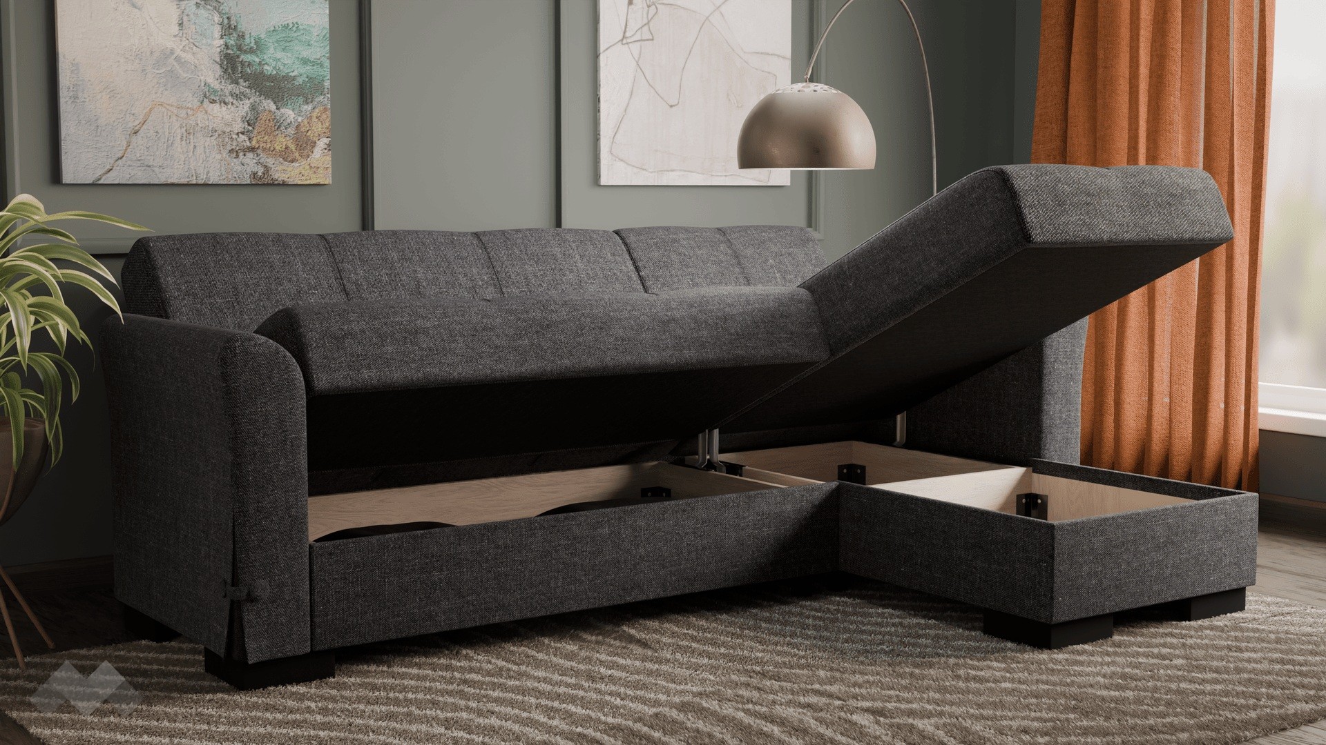 Конструкцията на ъгловия диван е изработена от комбинация от масивна дървесина, ПДЧ, метал и Бонел пружина, която гарантира дълготрайна стабилност и издръжливост на модела.