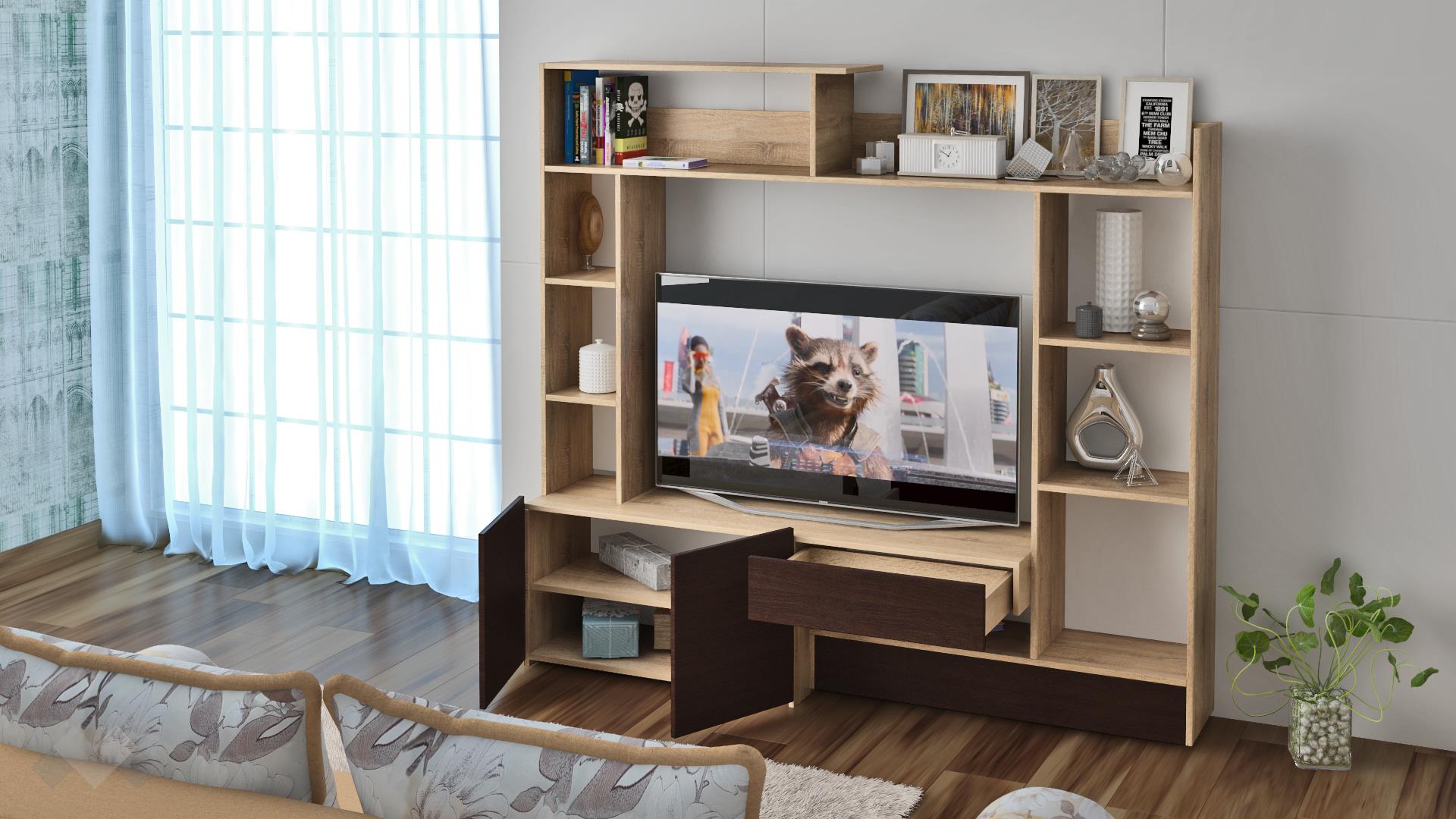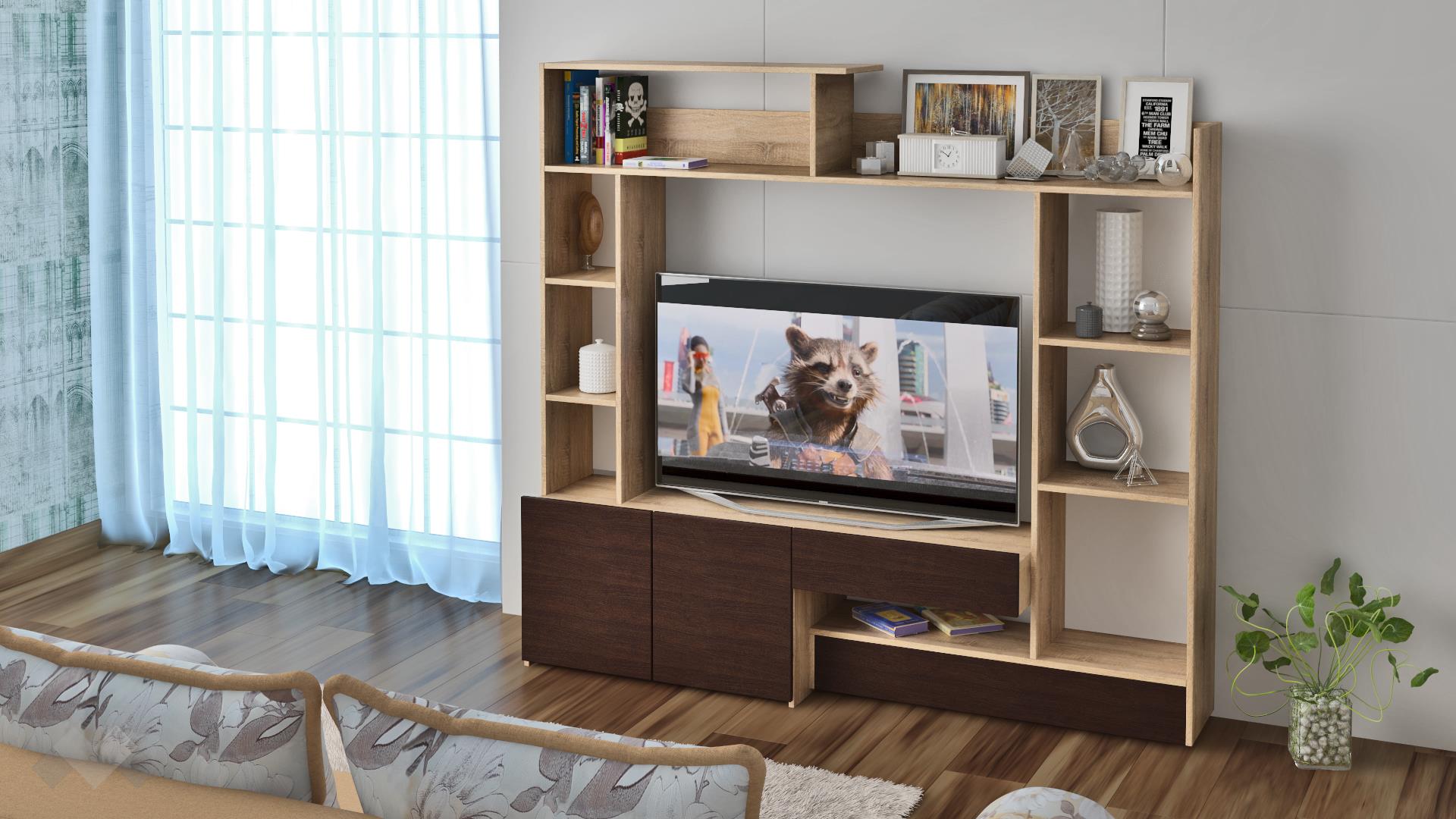 ✓ компактна и функционална ✓ практично разпределение ✓ семпъл и елегантен дизайн ✓ комбинация от класически светъл и тъмен декор ✓ подходяща и за по-малки жилища ✓ открити рафтове ✓ етажерка ✓ ТВ шкаф с място за ТВ - 104/90 см ✓ чекмедже ✓ качествена изработка ✓ 16 мм ПДЧ