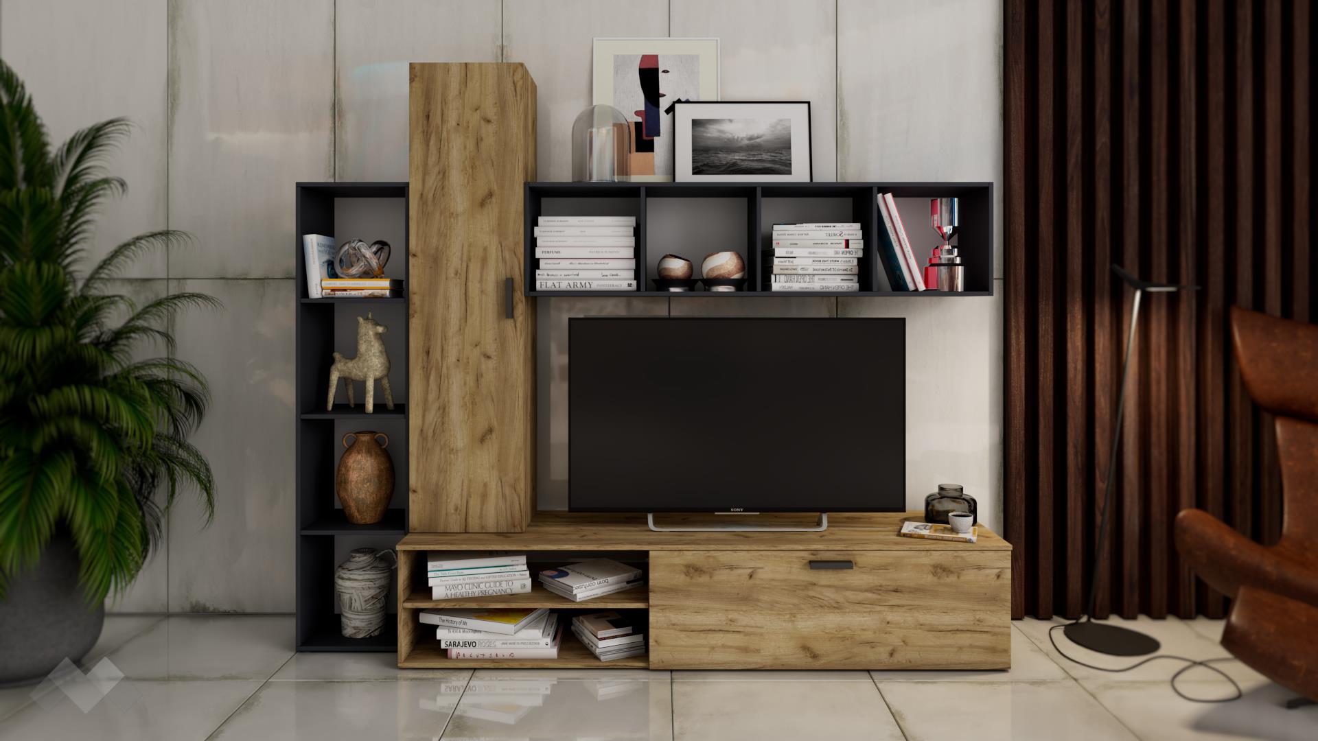 Секция Фреш впечатлява с ефектна визия, модерен дизайн и функционалност. Актуалната цветова комбинация в индустриален стил, внася допълнителен ефект на модела. ТВ шкафът разполага с плот, отворени рафтове и затворен шкаф. Там ще намериш място за всички декодери, конзоли и друга допълнителна техника.