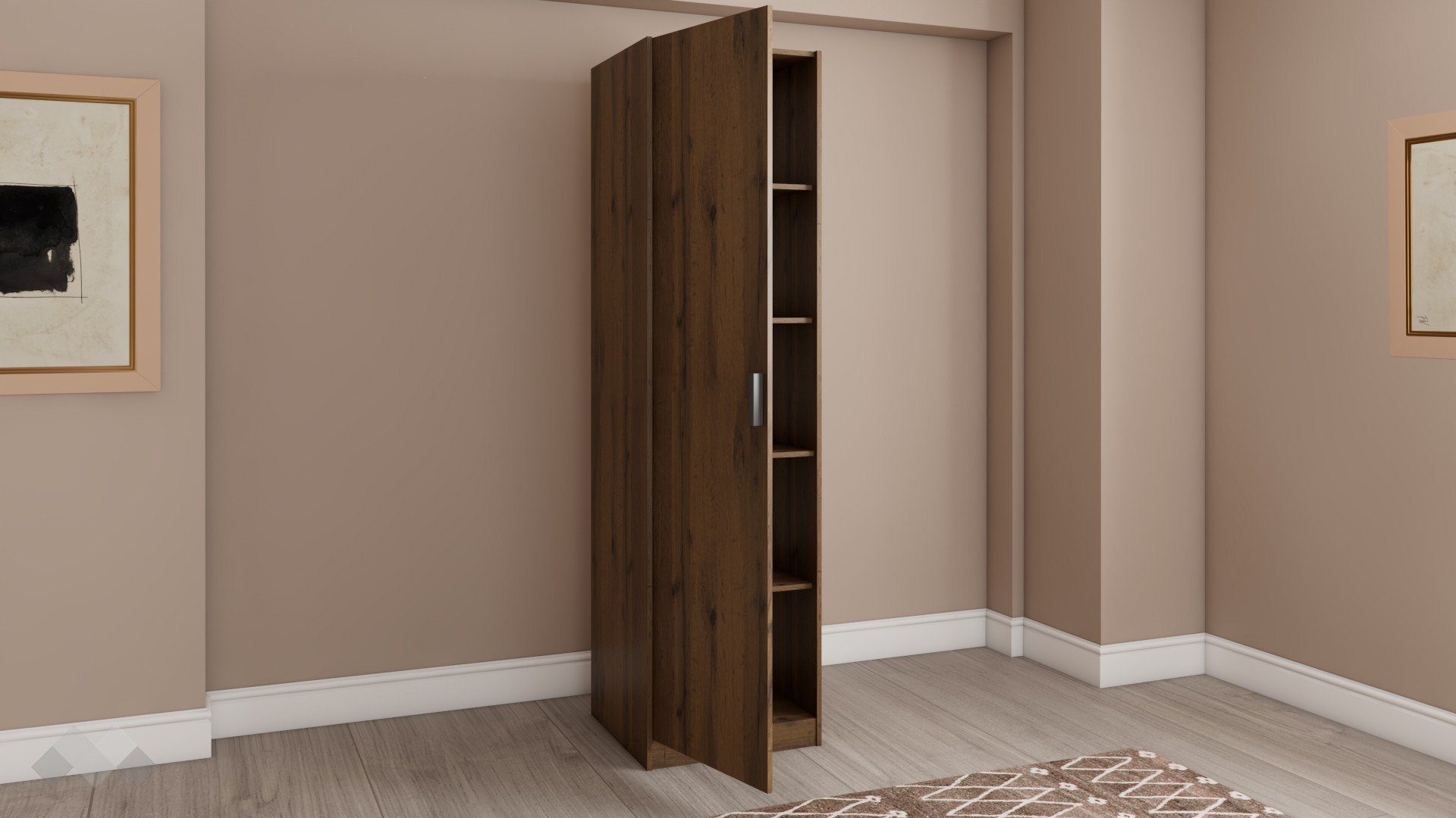 Този модел има практично разпределение, което ще ти позволи да подредиш прилежно всички дрехи и аксесоари. Той е еднокрилен с 4 обемни рафта. Можеш да използваш рафтовете за съхранение на сгънати дрехи, по-обемни пуловери, завивки или други вещи.