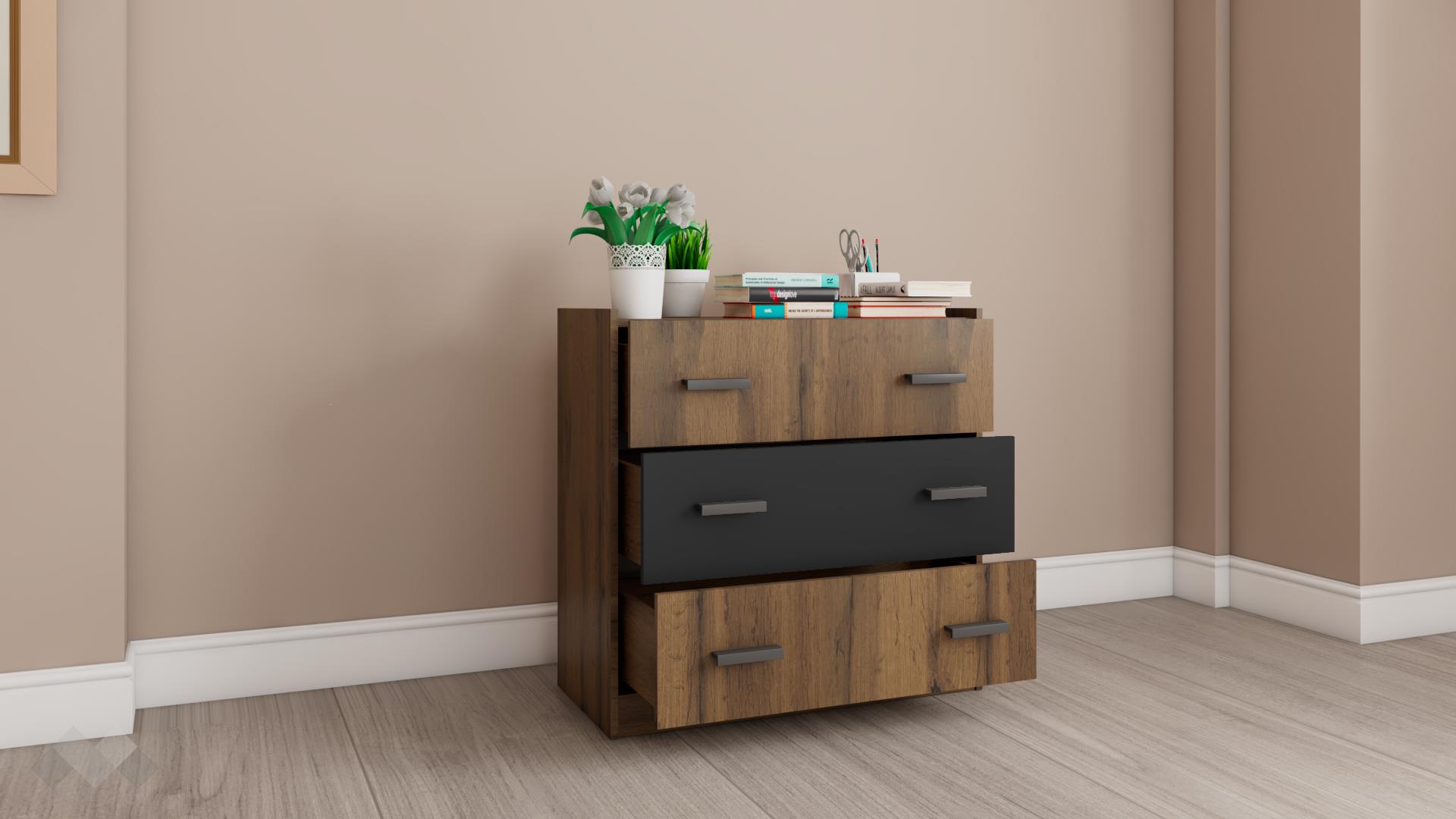 ⭐ Предимства: ✓ 3 чекмеджета ✓ компактен и практичен ✓ модерен винтидж декор с WNR структура ✓ качествена изработка ✓ 16 мм ПДЧ