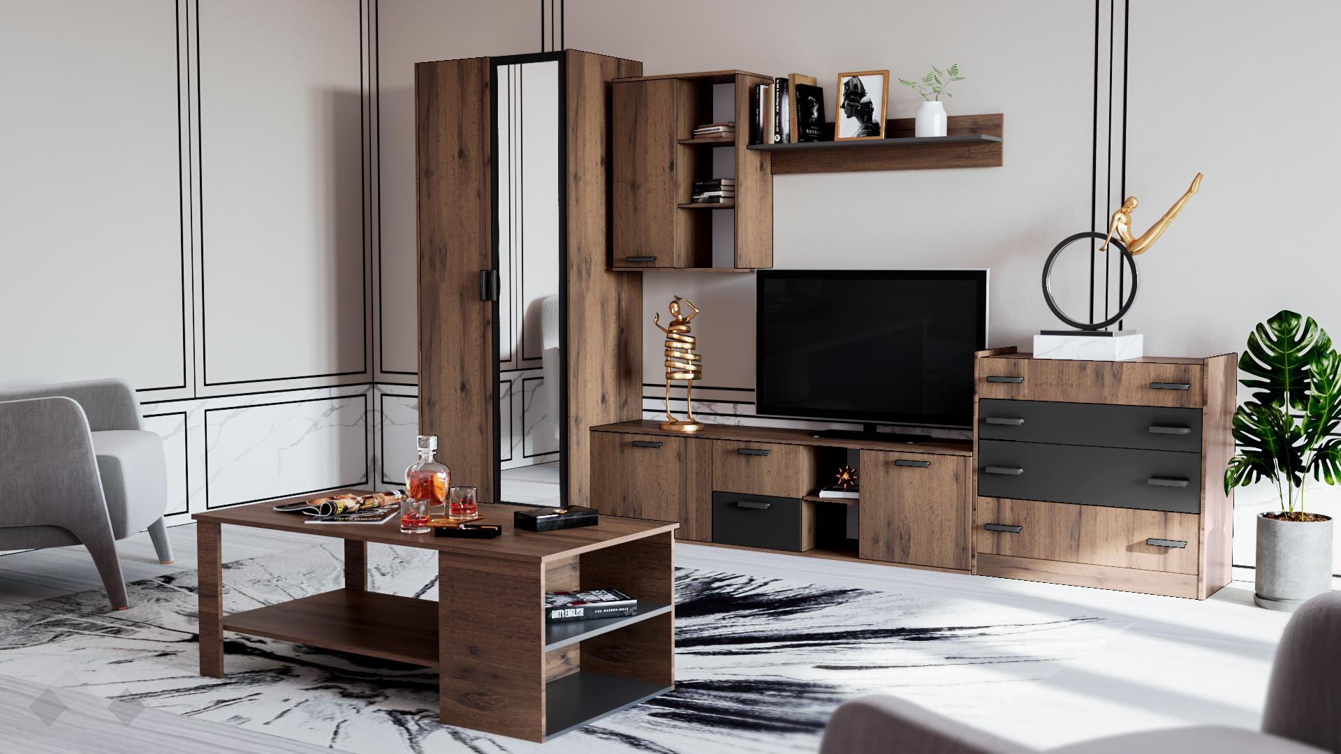 Различното в декора и материала на тази серия мебели е WNR меламиновото покритие - то не е гладко, а е с дървесна, релефна структура, имитираща и доближаваща се максимално до истинско дърво. Това прави тези мебели да изглеждат ефектни и невероятни. Конструкцията на скрина е изпълнена от устойчиво ламинирано ПДЧ с дебелина 16 мм, здраво и лесно за поддръжка.