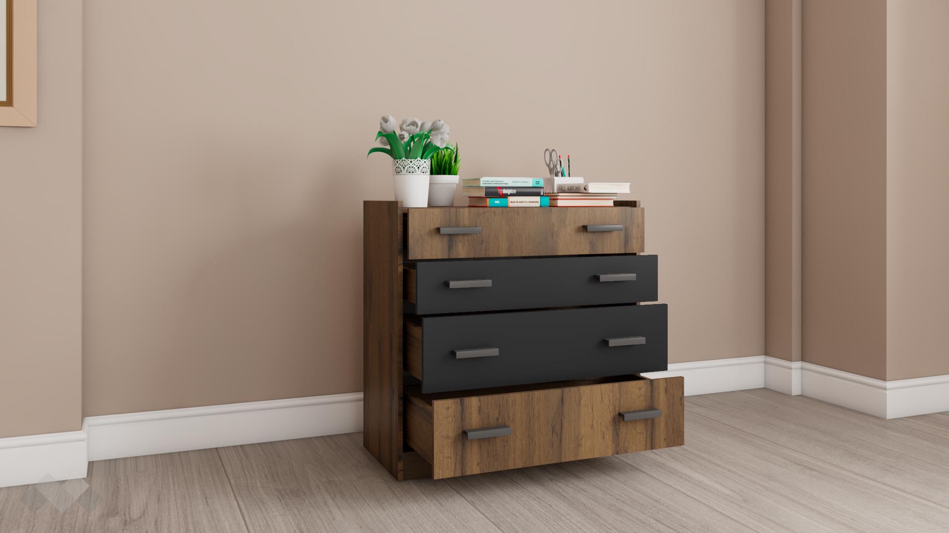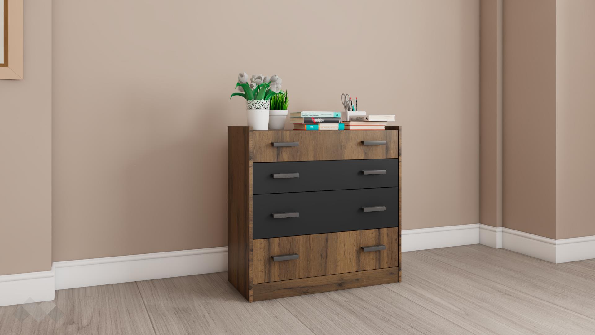 Практичен скрин, който можеш да разположиш във всяко помещение в жилището си. Благодарение на 4-те чекмеджета разполагаш с достатъчно място за организация на всякакви вещи и дреболии.