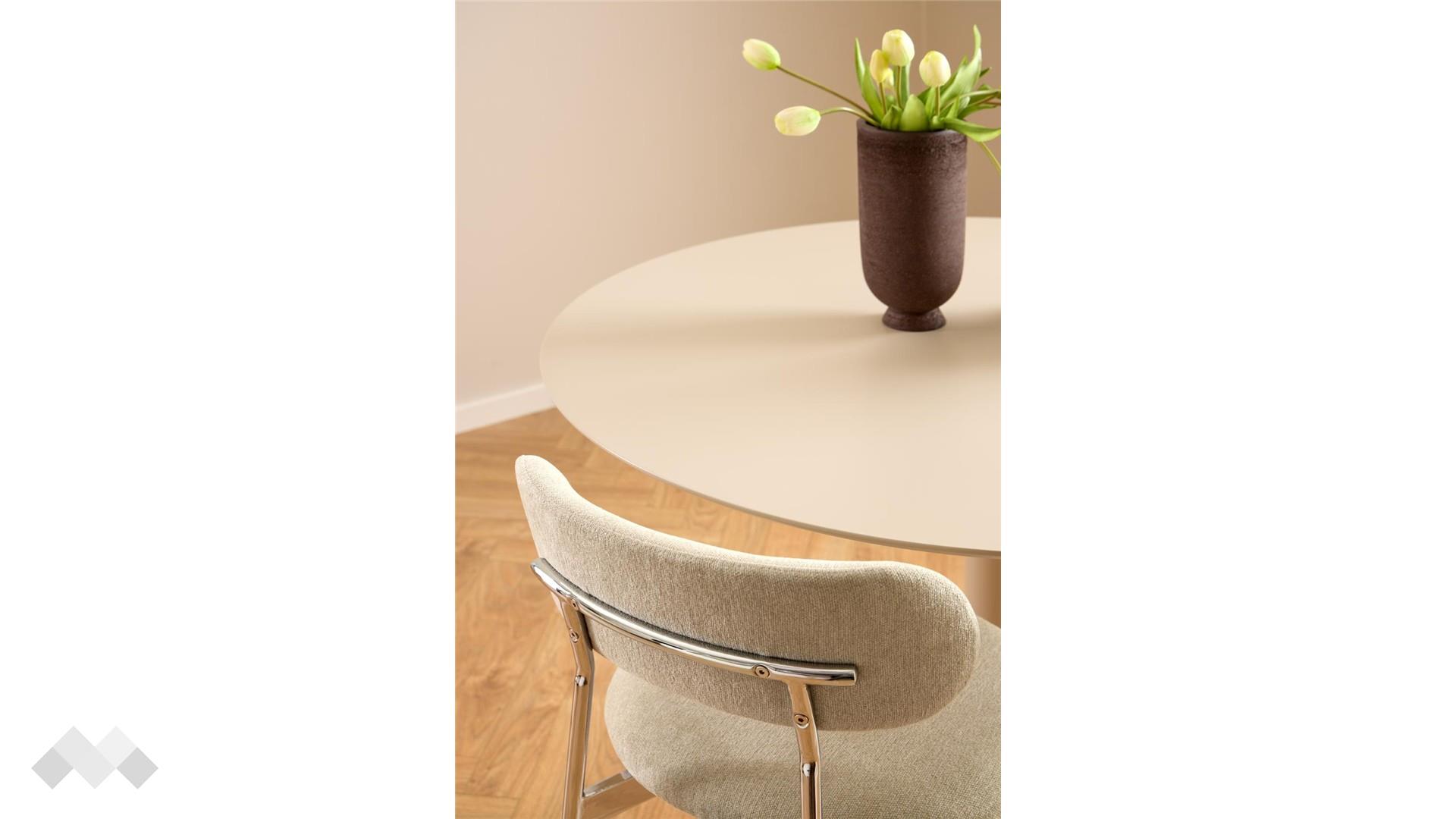 Трапезна маса Илита впечатлява със своя изчистен модерен дизайн и изискана визия. Кръглият ѝ плот, изработен от висококачествен МДФ, осигурява здравина и устойчивост, като същевременно придава лекота и елегантност на интериора.