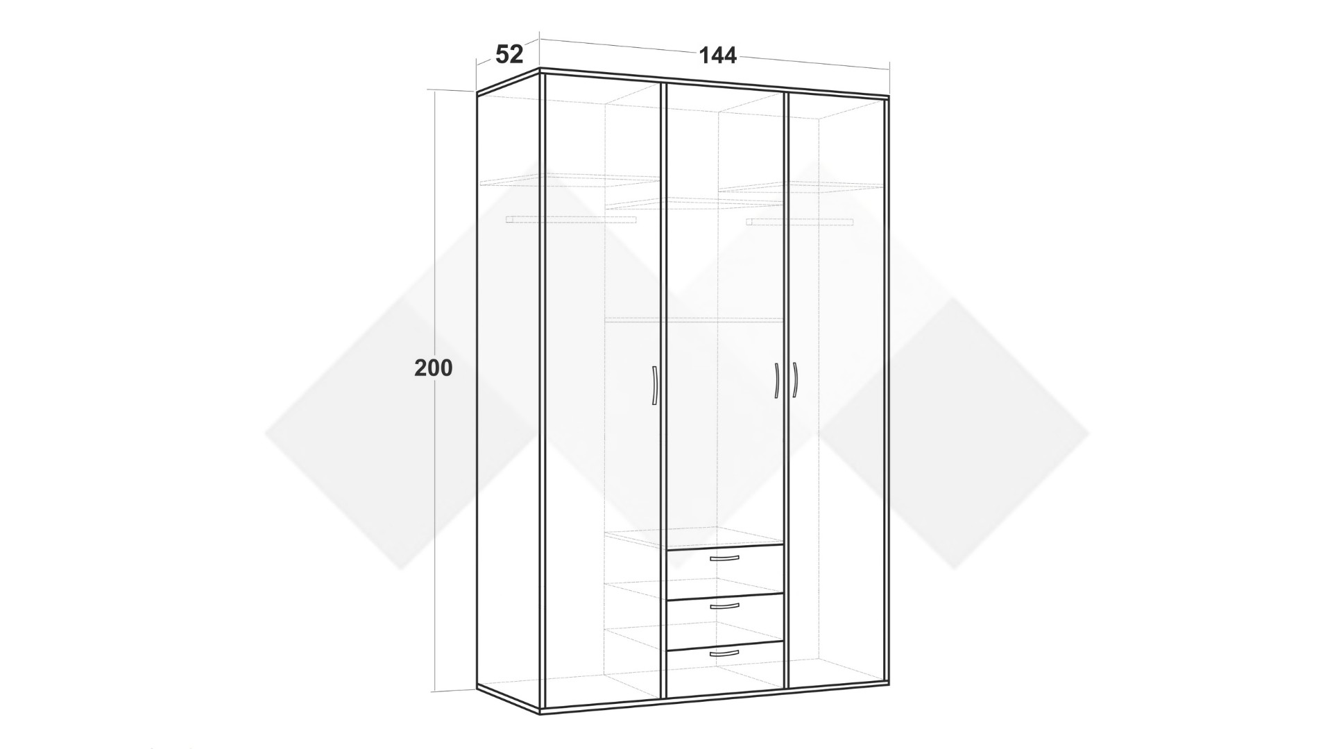 Този гардероб радва със своята практичност. На твое разположение са два лоста за закачалки в крайните крила, четири рафта за съхранение на дрехи или вещи и три чекмеджета в средното крило на гардероба. Така всичко ще бъде перфектно организирано.