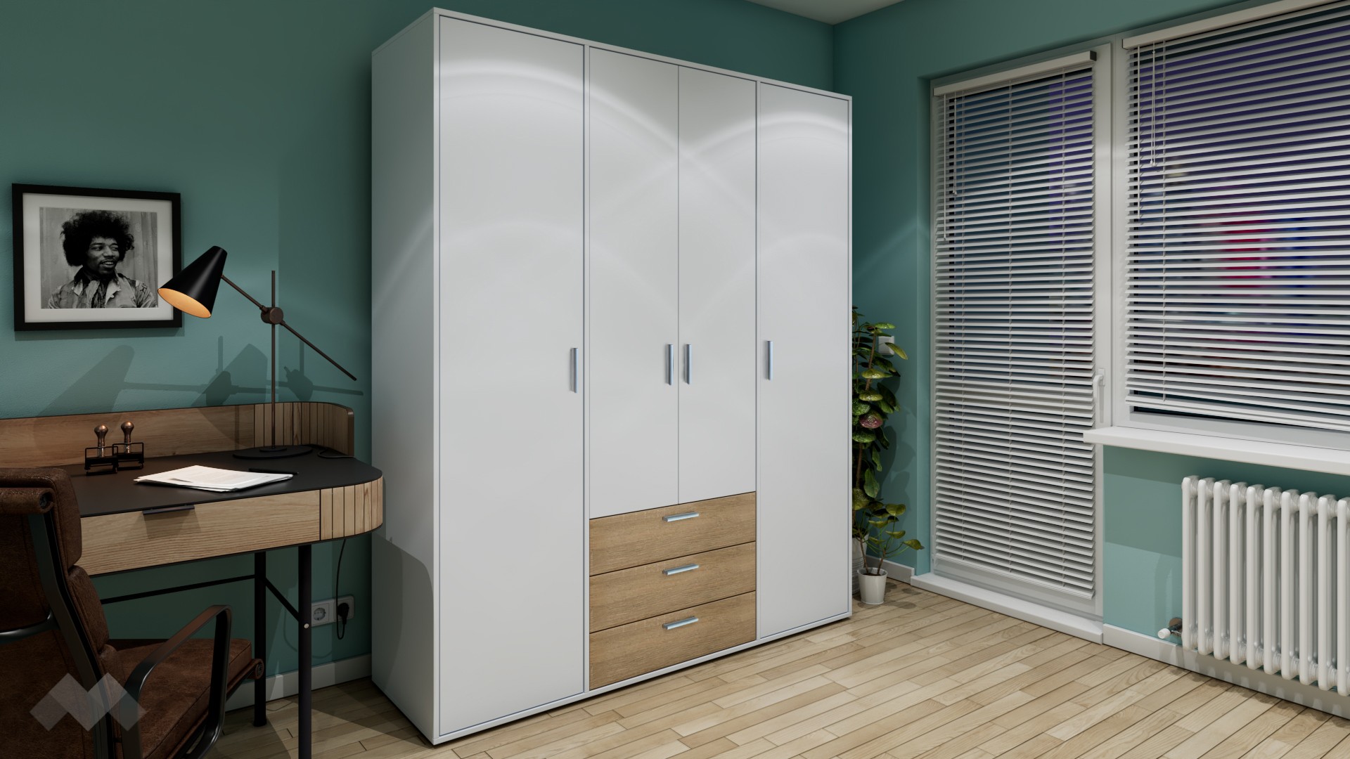 ⭐ Предимства: ✓ четирикрилен ✓ 3 чекмеджета ✓ 4 рафта ✓ 2 лоста за закачалки ✓ модерен декор ✓ практично разпределение ✓ качествена изработка ✓ 16 мм ПДЧ