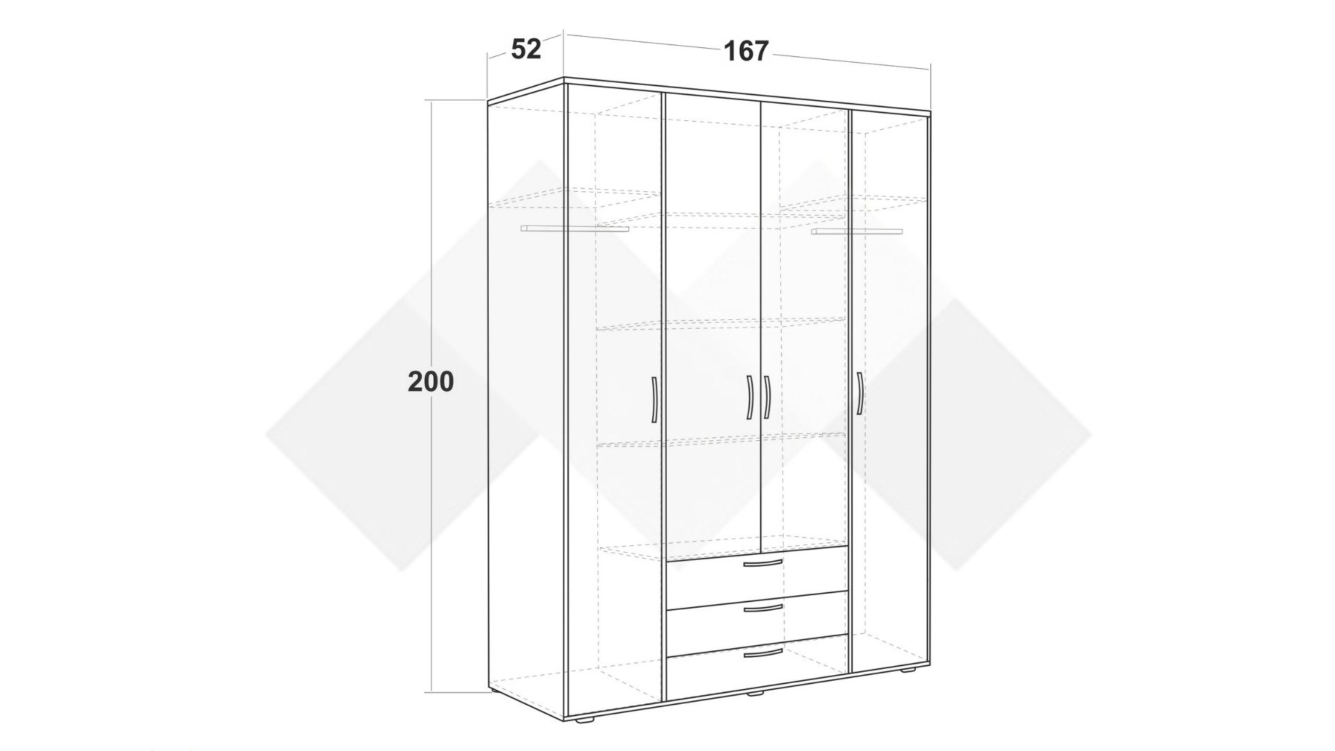 На твое разположение са два лоста за закачалки, където можеш да съхраняваш ризи, сака или палта. Гардеробът е с четири рафта, на които можеш да организираш сгънати дрехи, хавлии, завивки или аксесоари. За още по-голямо удобство сме добавили и три просторни чекмеджета, подходящи за съхранение на бельо, чорапи или дребни принадлежности.