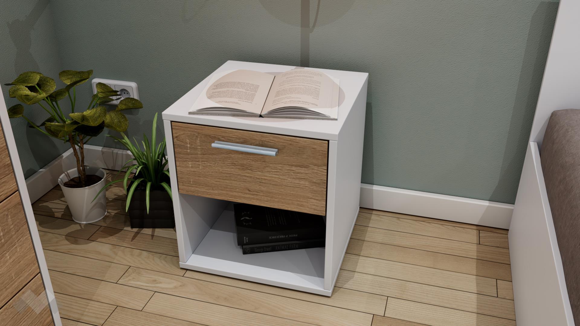 Нощно шкафче Жизел е малко, но практично. Благодарение на оптималната му височина, то ще пасне на всяко легло. Чекмеджето и отвореният рафт ти предоставят достатъчно място за съхранение на всички най-необходими вещи, за да са винаги на една ръка разстояние. Върху горния плот можеш да поставиш нощна лампа или книгата, която четеш преди сън.
