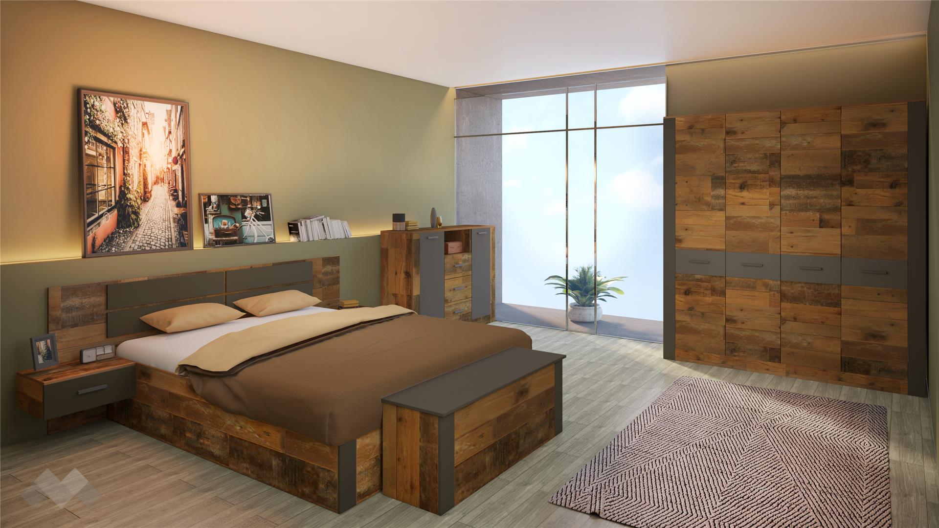 ⭐ Предимства: ✓ модерен винтидж декор ✓ спалня с нощни шкафчета ✓ ракла ✓ скрин ✓ просторен гардероб ✓ качествена изработка ✓ 16 мм ПДЧ