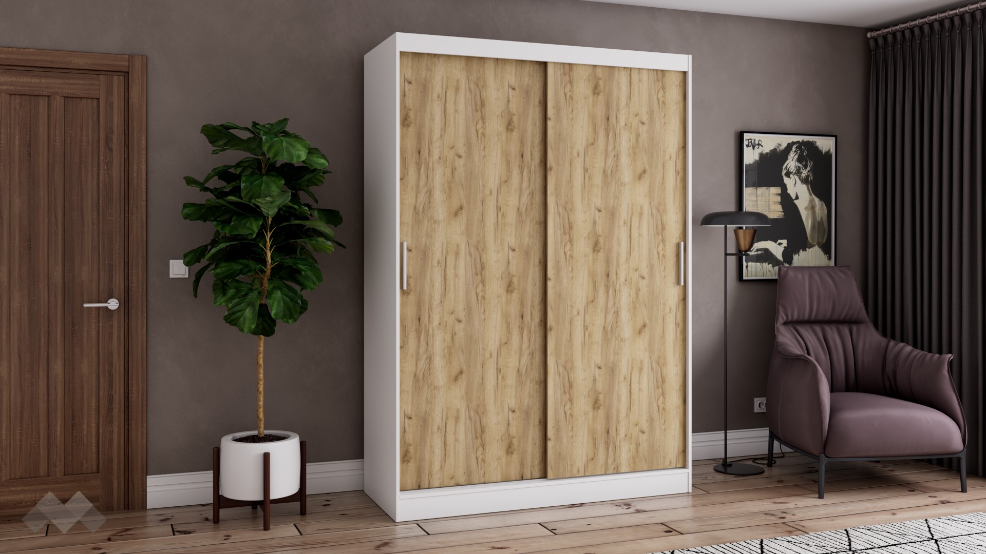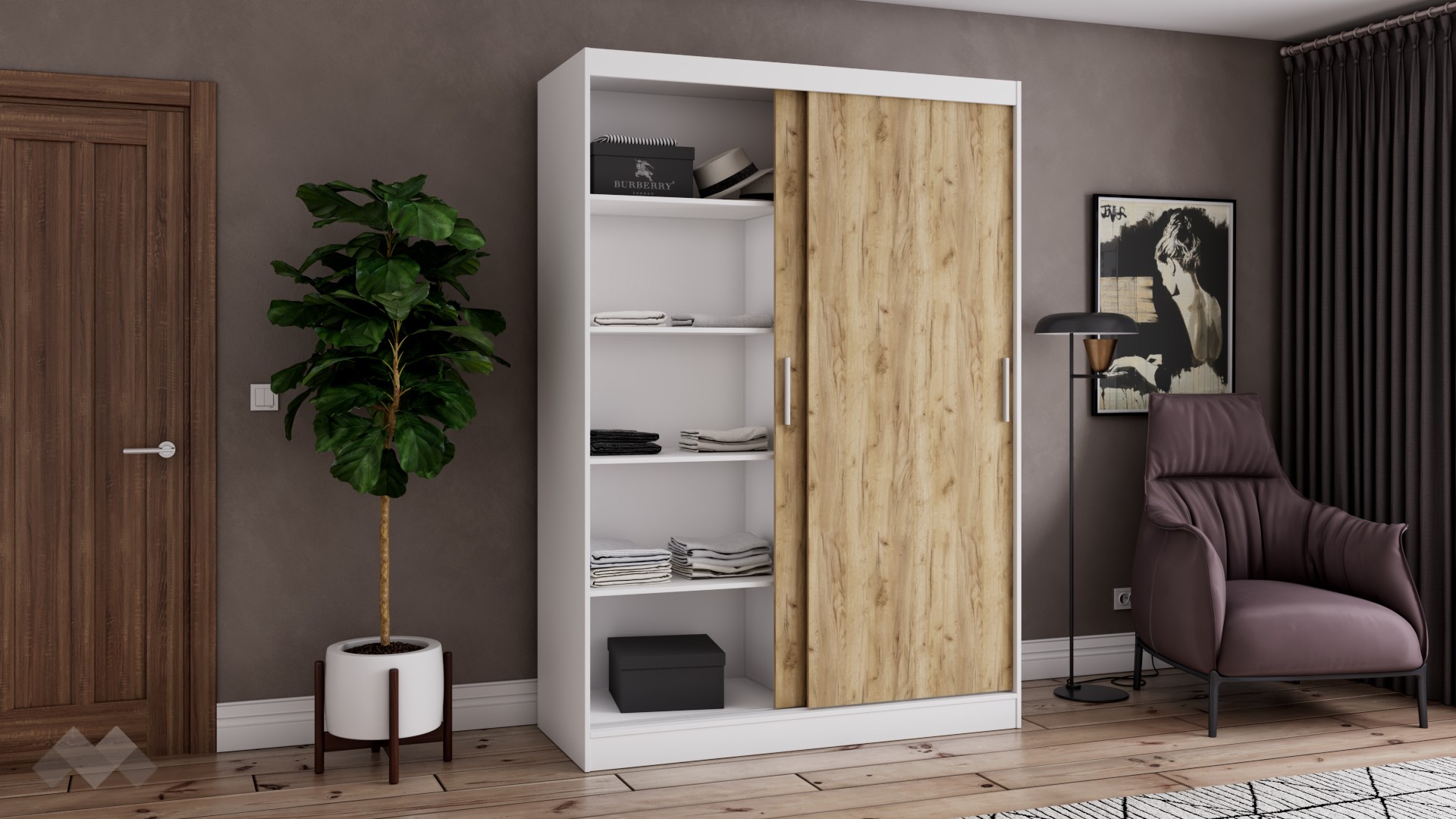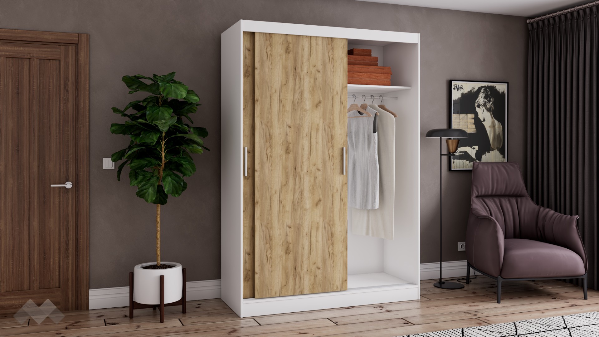 Той е четирикрилен гардероб с плъзгащи врати. Модерният плъзгащ механизъм прави отварянето на вратите лесно, без да се тревожиш, че трябва да осигуриш допълнително пространство пред самия гардероб. Това го прави особено подходящ и за по-малки спални помещения. Щом го отвориш, вътре се откриват четири големи рафта с оптимална височина и просторно крило за закачалки.