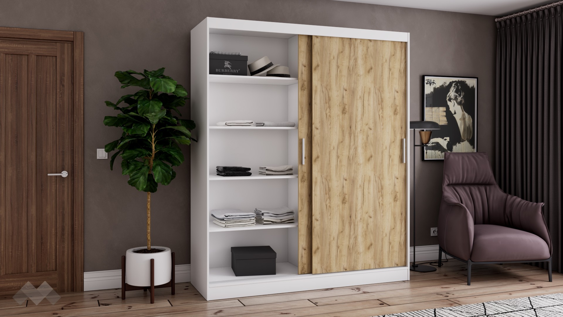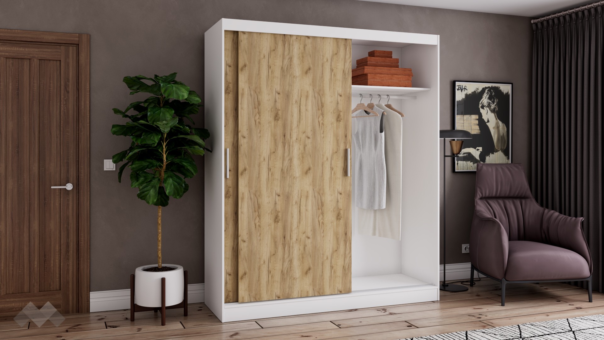 Той е четирикрилен гардероб, който се отваря чрез плъзгащи врати. Модерният плъзгащ механизъм прави отварянето на вратите лесно, без да се тревожиш, че трябва да осигуриш допълнително пространство пред самия гардероб. Щом ги отвориш, вътре се откриват четири големи рафта с оптимална височина и просторно крило за закачалки.