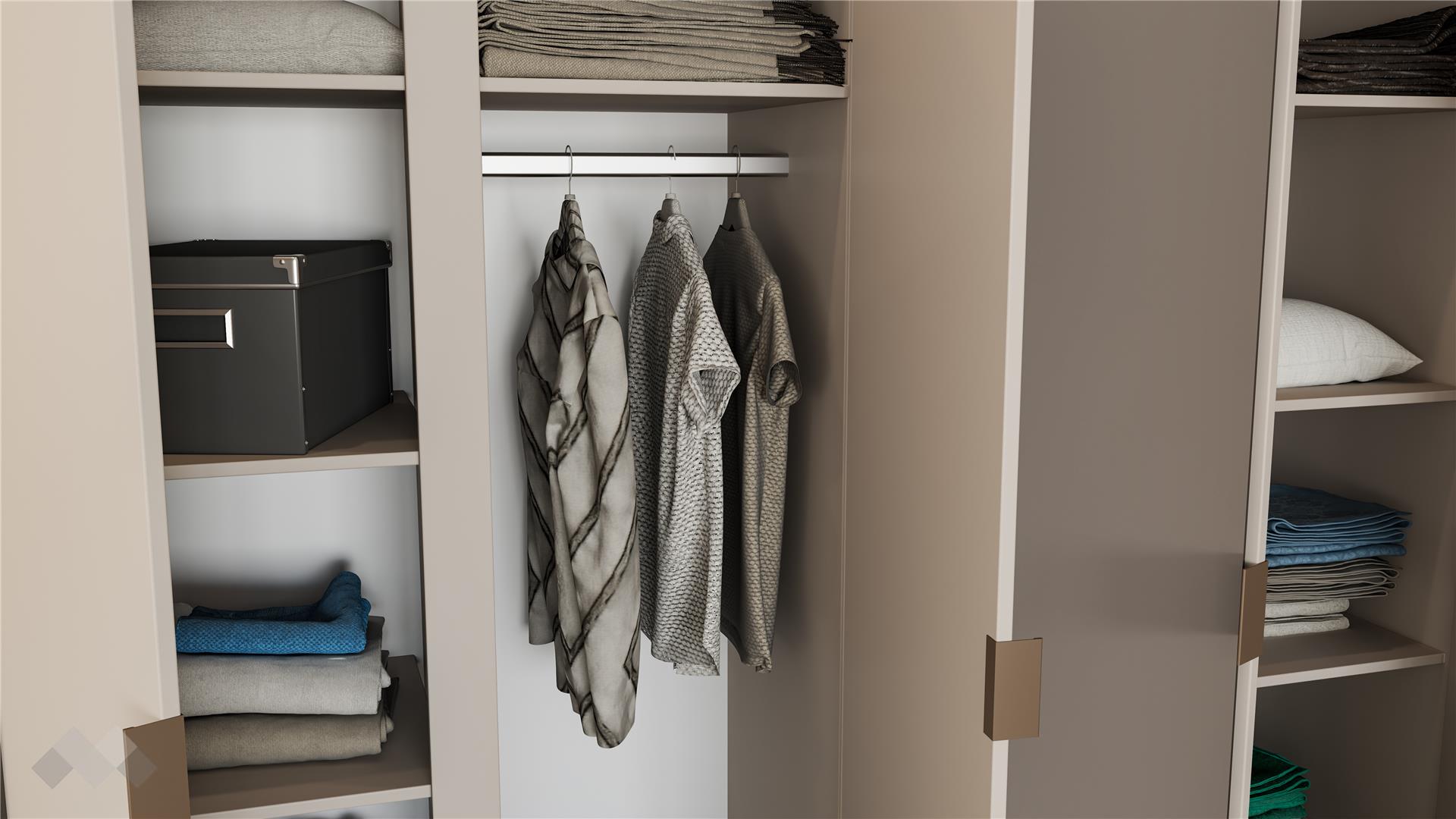 Гардеробът е проектиран с мисъл за максимално удобство и практичност. Разположеното огледало на вратата не само добавя функционалност, но и визуално разширява пространството. Просторните дванадесет рафта и двата лоста за закачалки осигуряват перфектната организация на дрехите. Със своето елегантно излъчване и фини детайли, този гардероб е не само практичен, но и стилен елемент, който добавя завършеност на твоята спалня.