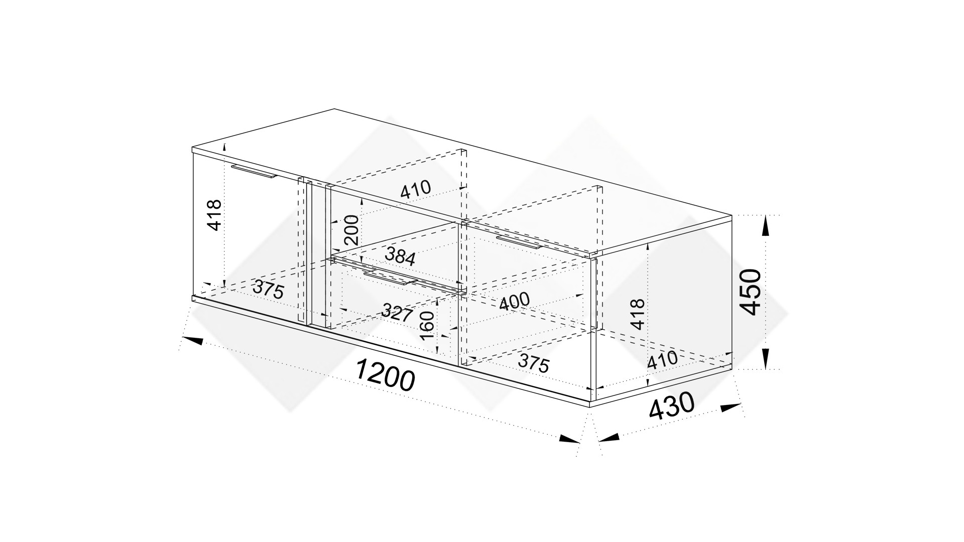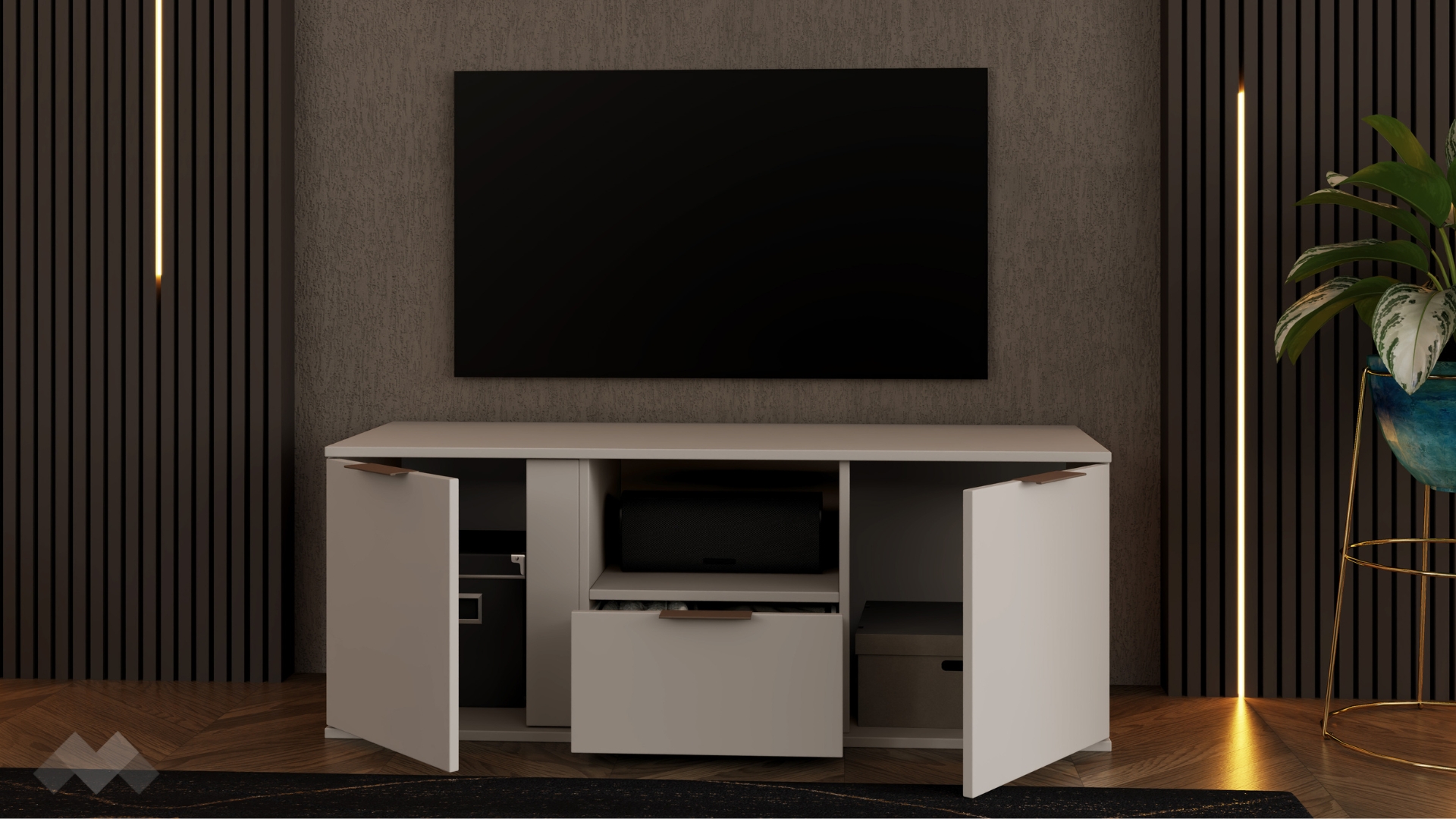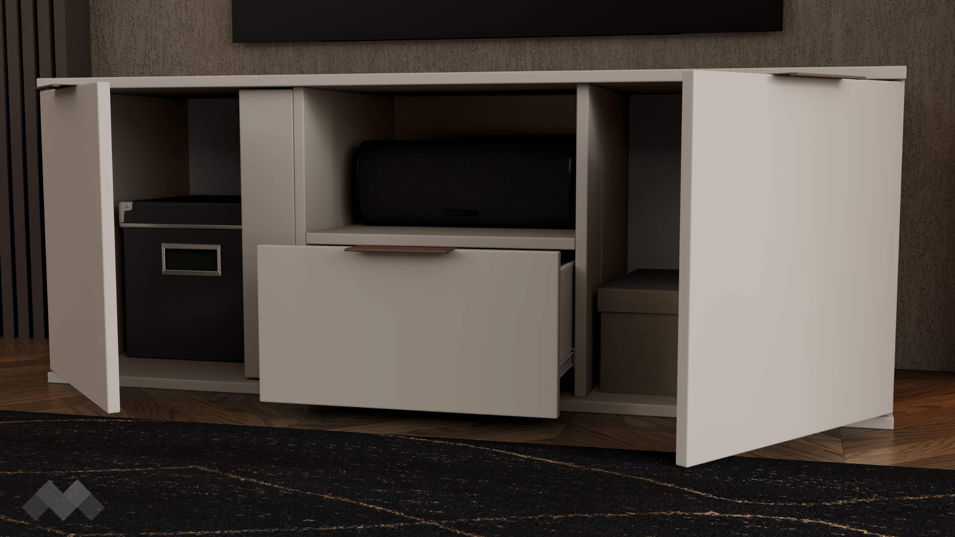 Моделът разполага с два затворени шкафа, открит рафт и чекмедже. С двата си затворени шкафа осигурява достатъчно място за съхранение на всичко необходимо – от медийни устройства и дистанционни до книги и аксесоари. В чекмеджето можеш да организираш всички вещи, които искаш да останат скрити, или техника, която не използваш толкова често, но в същото време ще ти е винаги под ръка. Откритият рафт е чудесно място за цялата съпътстваща техника, като ТВ приемници и други, или за любимите ти книги, сувенири и декорации.