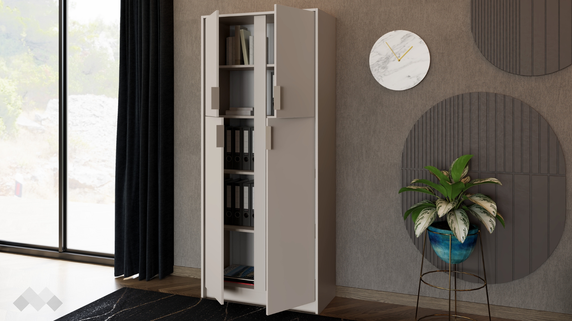 Шкафът разполага с четири вратички, зад които се крие практично вътрешно пространство с четири рафта за по-лесно подреждане. Той е перфектното решение за организиране на всякакви документи, папки, книги и офис консумативи. Благодарение на четирите вътрешни рафта можеш лесно да разделиш вещите си и да поддържаш реда, като всяко нещо има своето място.